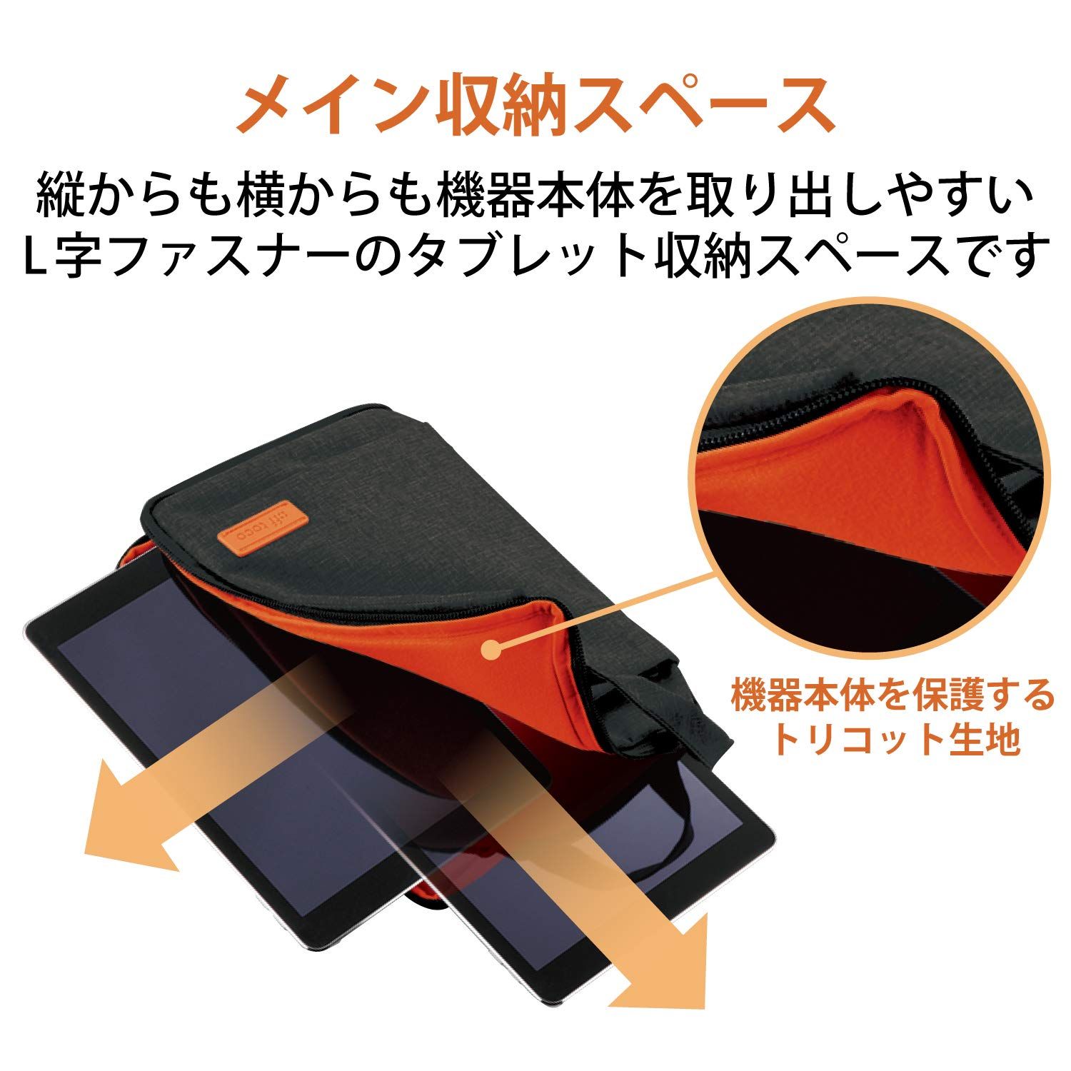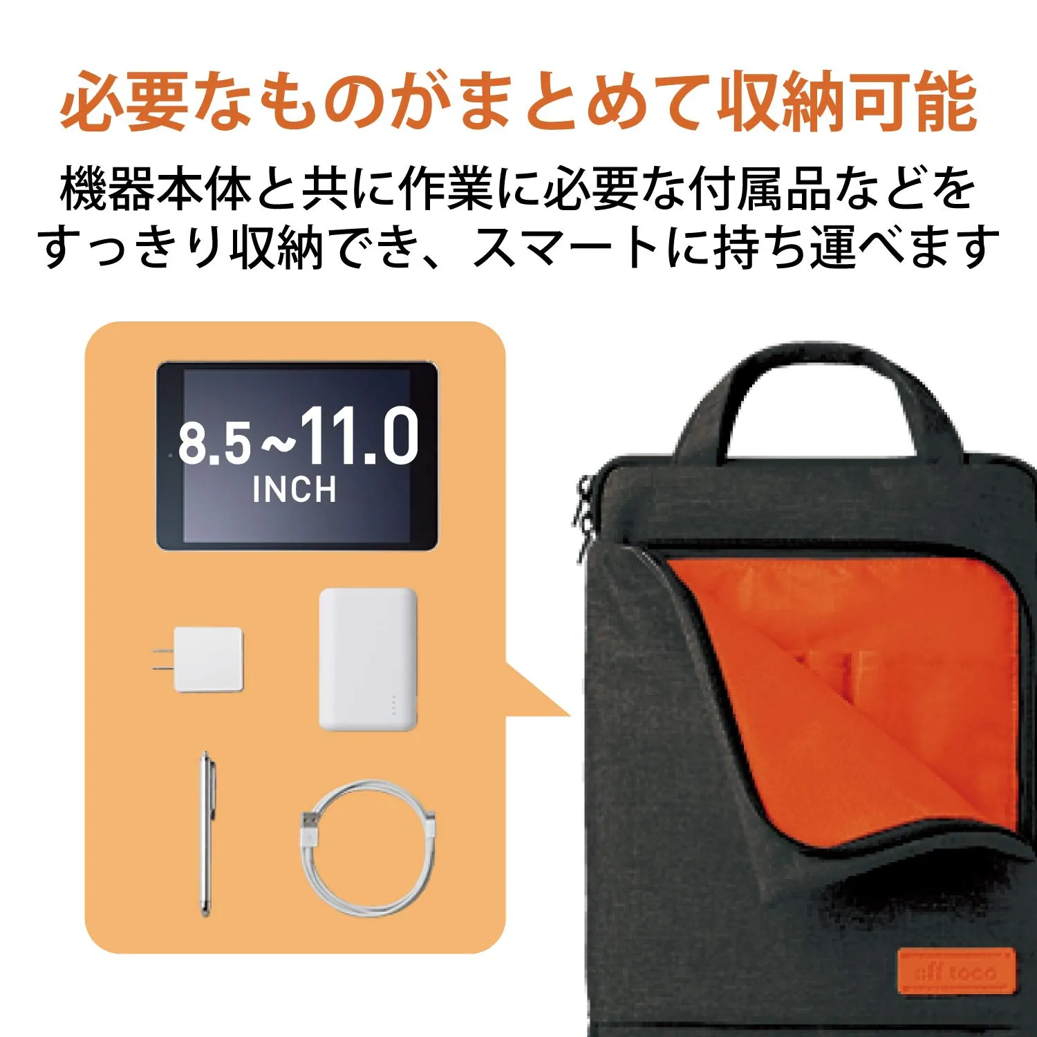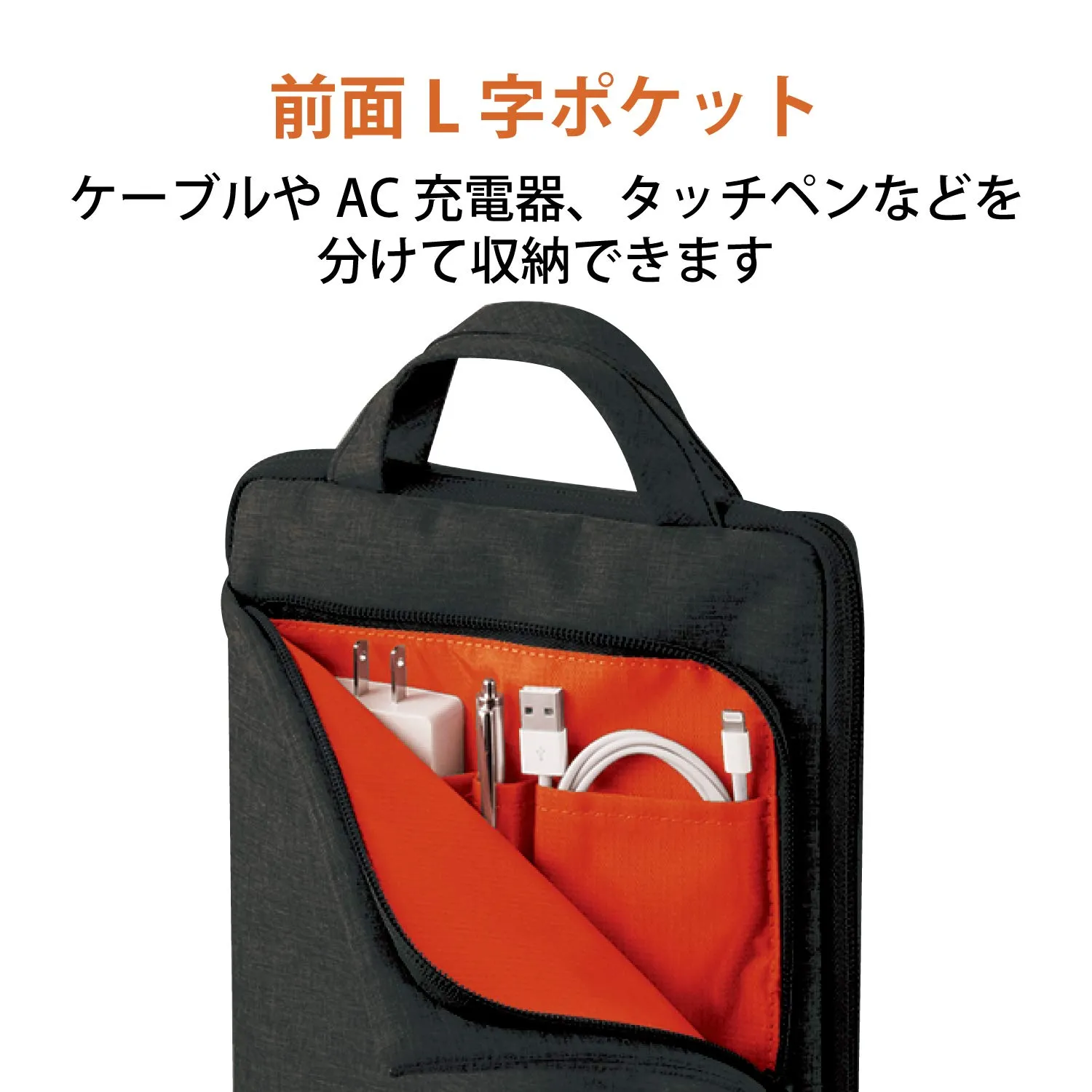 機器本体と共に、ケーブル・AC充電器・タッチペン・モバイルバッテリーなどを専用ポケットに分けてすっきり収納しスマートに持ち運べます。8.5~11インチのタブレットPCを収納可能です。トリコット生地を使用しており、傷つけずに持ち運べます。タブレットPC収納部はL字ファスナーによって、縦からも横からも取り出しやすい構造です。前面に、大きく開き、アクセサリー類を分けて収納できるL字ポケットが付いています。背面のマチ付きポケットにモバイルバッテリーを入れて、持ち運びしながら機器本体を充電可能です。