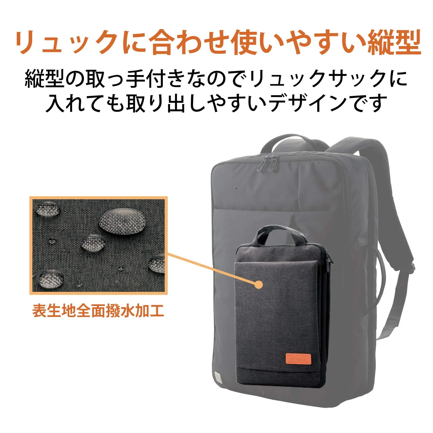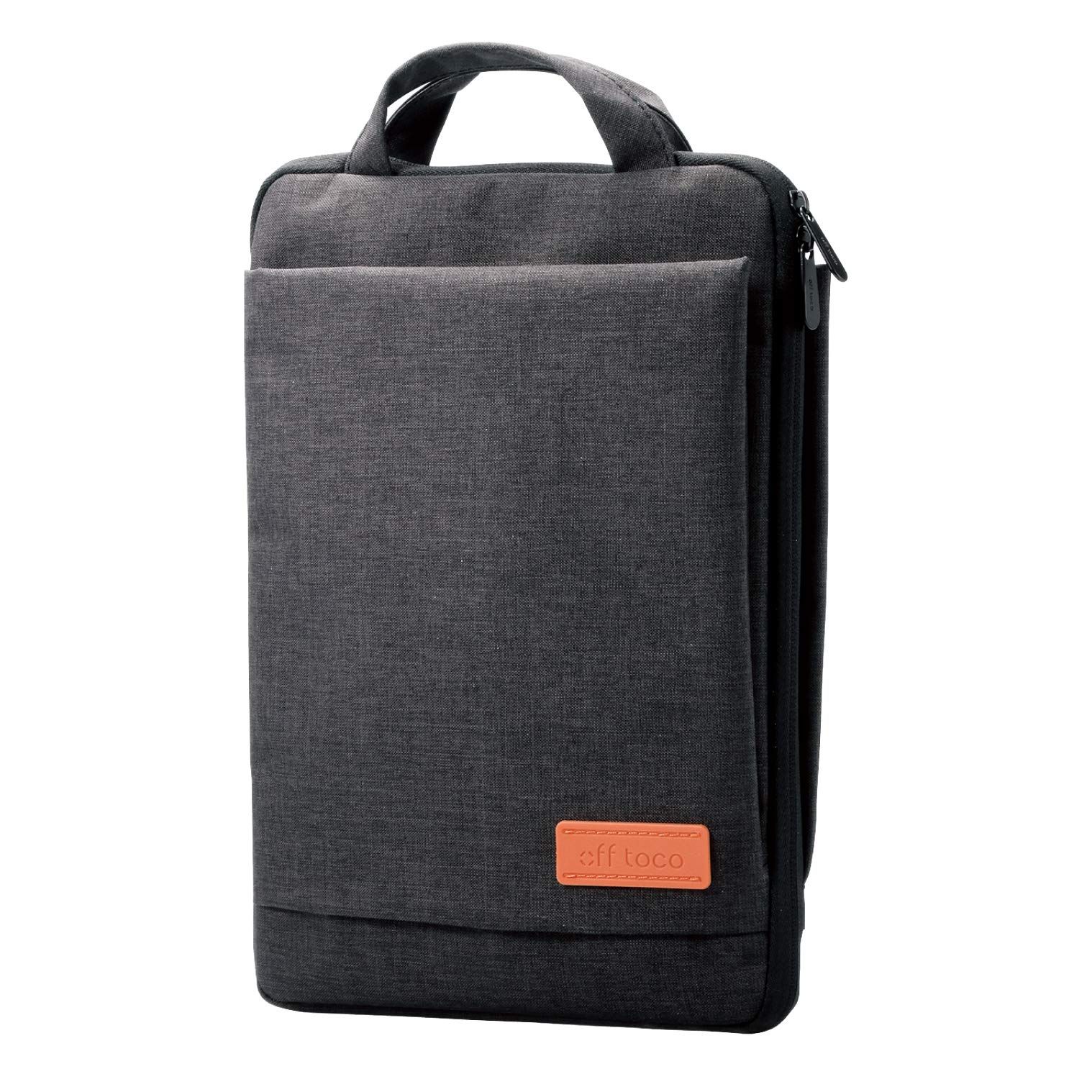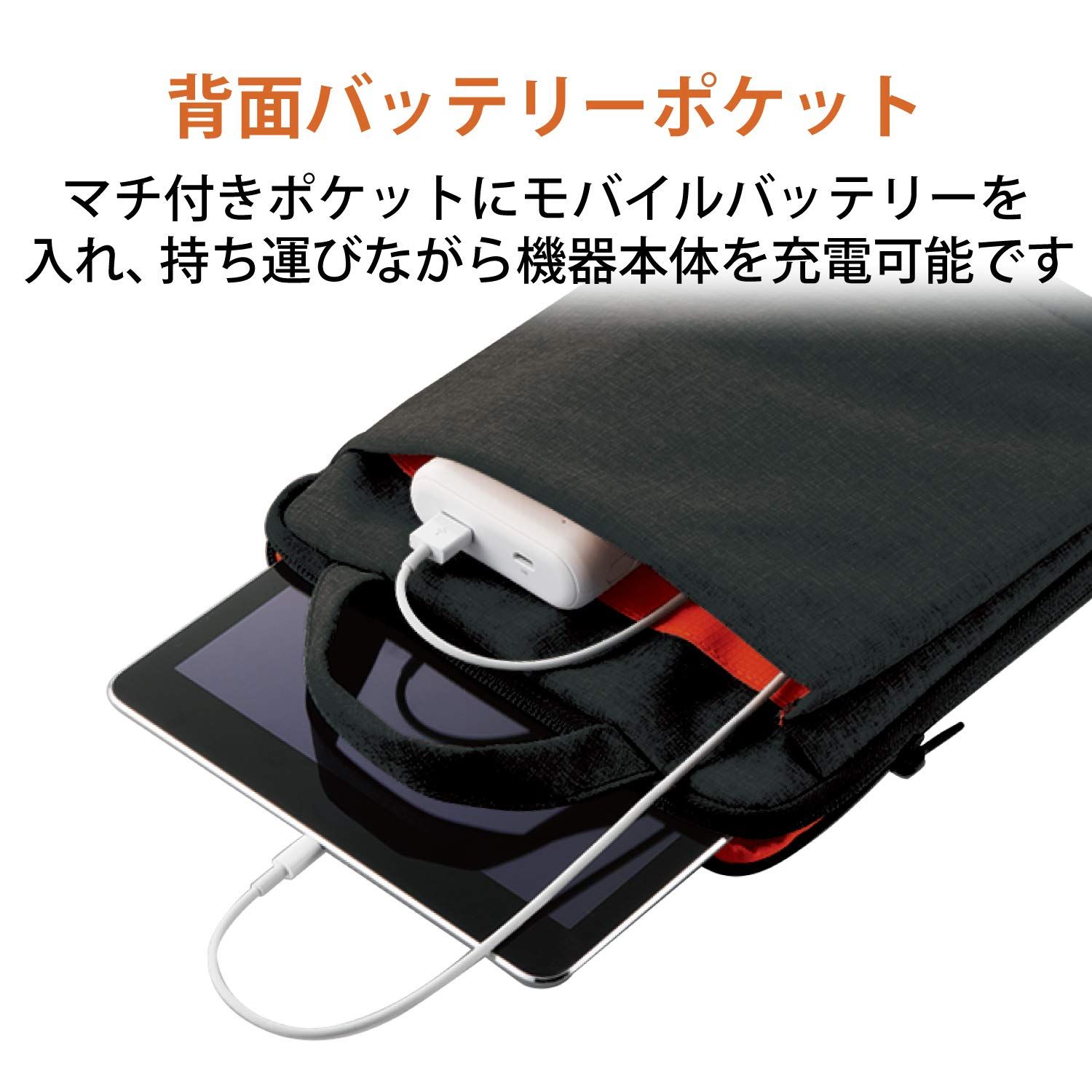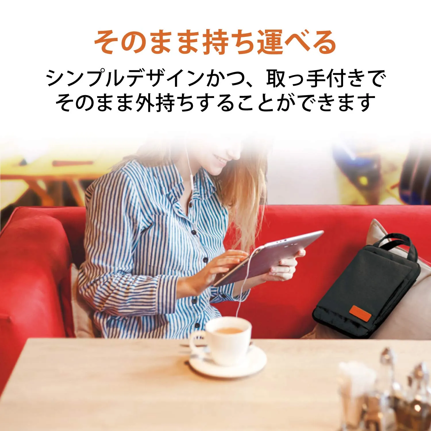 機器本体と共に、ケーブル・AC充電器・タッチペン・モバイルバッテリーなどを専用ポケットに分けてすっきり収納しスマートに持ち運べます。8.5~11インチのタブレットPCを収納可能です。トリコット生地を使用しており、傷つけずに持ち運べます。タブレットPC収納部はL字ファスナーによって、縦からも横からも取り出しやすい構造です。前面に、大きく開き、アクセサリー類を分けて収納できるL字ポケットが付いています。背面のマチ付きポケットにモバイルバッテリーを入れて、持ち運びしながら機器本体を充電可能です。
