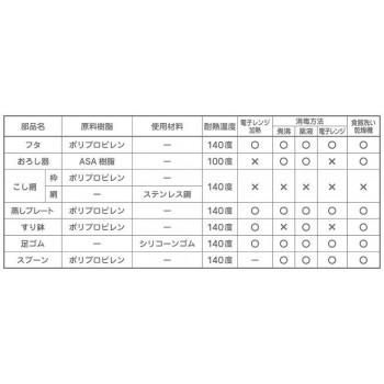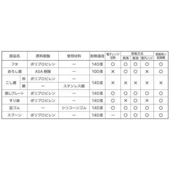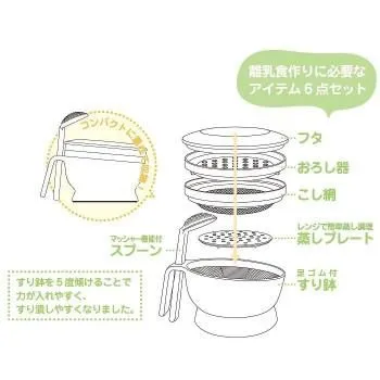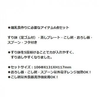 すり鉢(足ゴム付)・蒸しプレート・こし網・おろし器・ スプーン・フタ付きです。