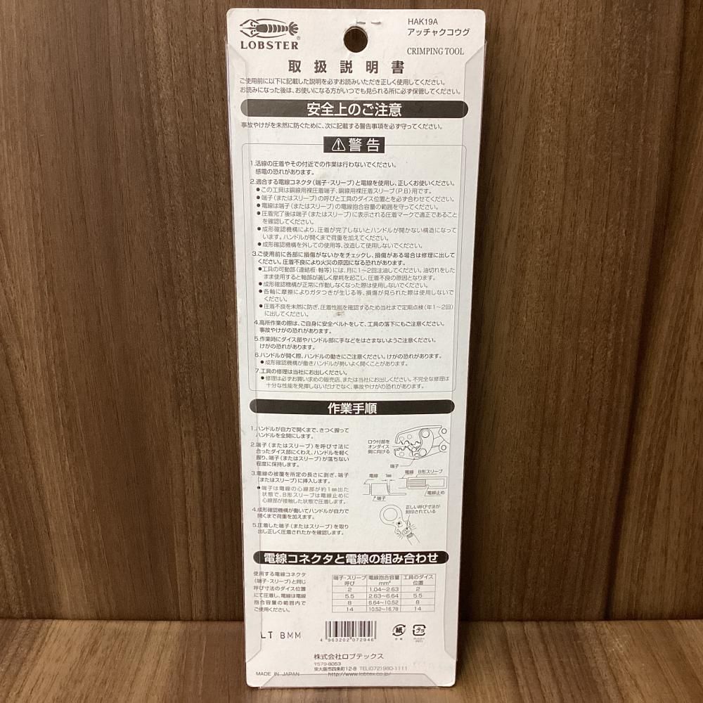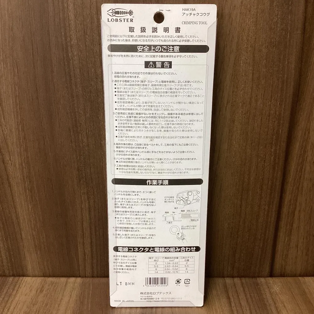 ご覧いただきありがとうございます LOBSTER/ロブスター HAK19A 圧着工具 銅線用裸圧着端子・裸圧着スリーブ(P.B)用です 状態:未使用 ・写真に写っているものが全てです ・商品の仕入れ、保管時の細かい傷や汚れがありますので写真でご確認ください 店頭併売につき、品切れの際はご了承ください