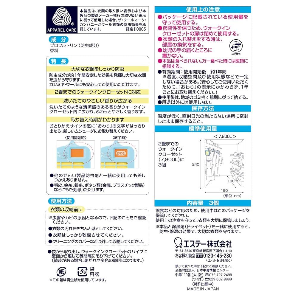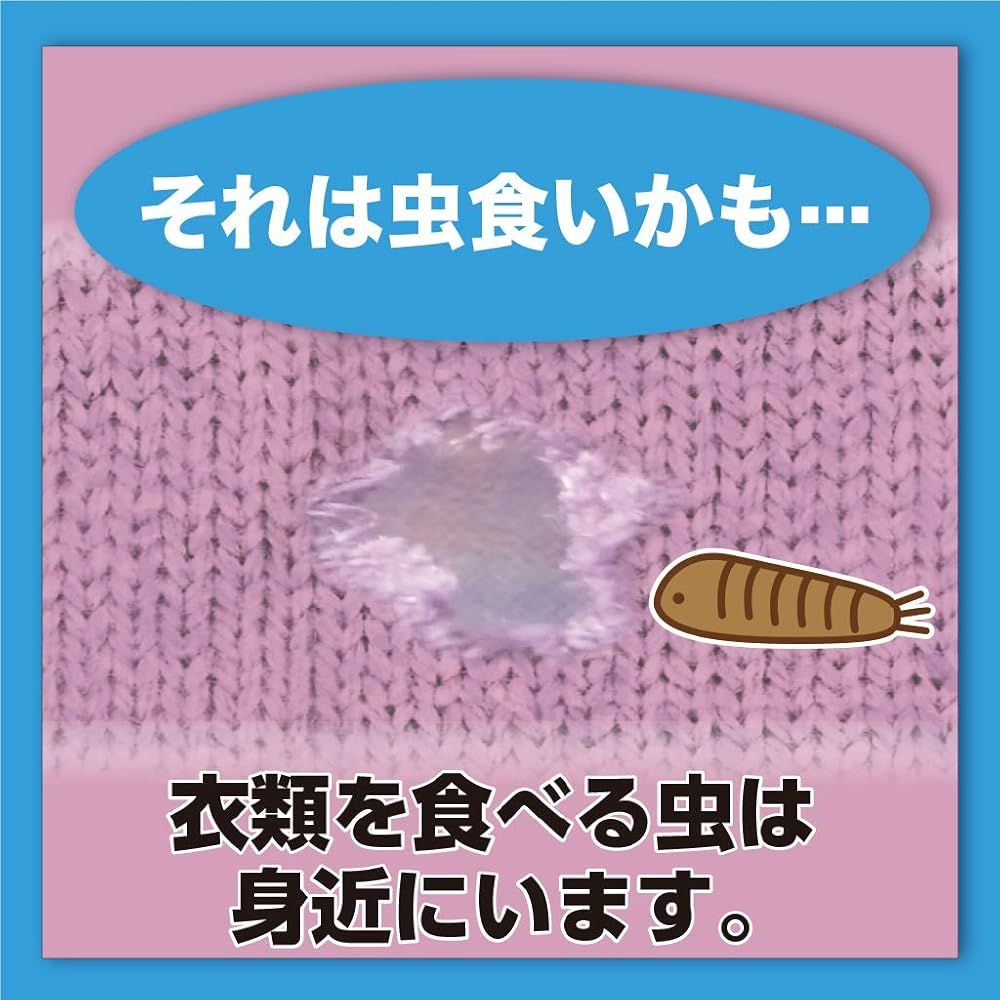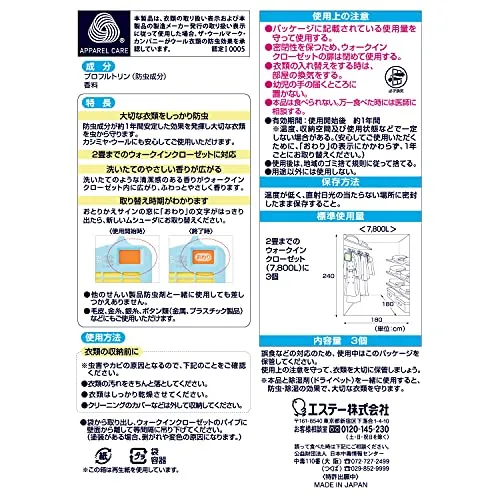 この製品は化学物質を含みます。取り扱いに注意してください。使用方法に従ってください。有効期限内に交換してください。 「主な仕様」大切な衣類を約1年間しっかり虫から守ります。