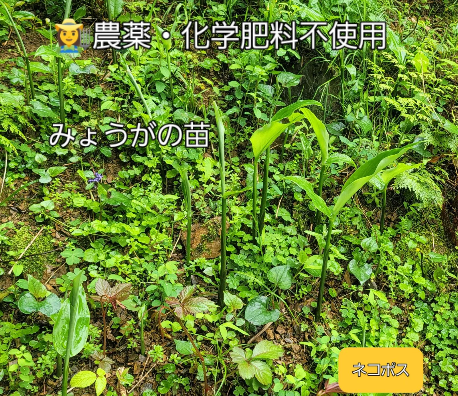 💌人も車もほとんど通らない敷地内の畑で、雑草を手で抜き、農薬や化学肥料も使わずに栽培している露地物のみょうがの苗6本をネコポスでお届けします。