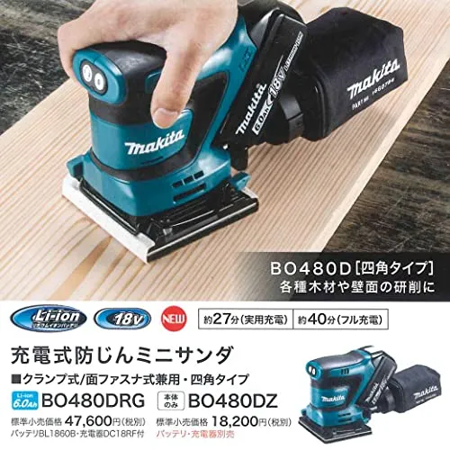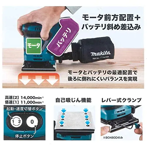AC機同等以上の作業能率、「四角タイプ」・クランプ式/面ファスナ式兼用。各種木材や壁面の研削作業に。モータ前方配置バッテリ斜め差込み。モータとバッテリの最適配置で後ろに倒れにくいバランスを実現。