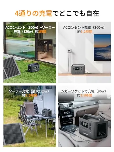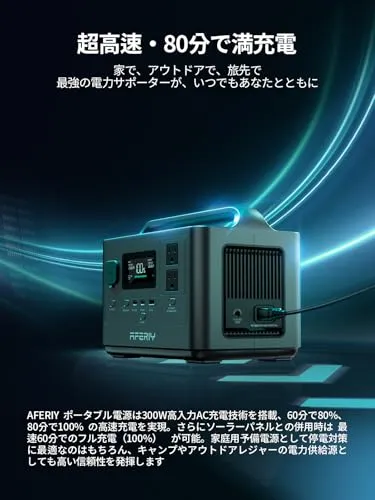 【300W自給充電レート・ 圧倒的スピード】AFERIY ポータブル電源 Nomad400は、AC高速充電技術を搭載し、最大300WのAC充電に対応しており、50分で80%充電・70分での満充電を実現。驚くべきことに、AC充電とソーラーパネルを併用することで60分程度でフル充電、充電速度の革新です。さらに、シガーソケット充電ポートも装備しているので、走行中でもポータブル電源に電力を補給することも可能だ。