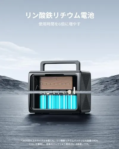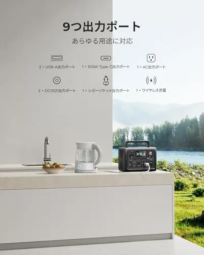 【超小型・高出力】家庭用AC(100V 600W)*2、USB-A*2、USB-C*1、5521DC*2、ワイヤレス充電*1、シガーソケット出力*1を含む9つの出力ポートから同時充電を行えます。また、電力リフト機能より、高出力な電化製品の出力を下げることが可能です。最大出力600Wですが、場合によっては600Wから最大1200Wまでの電化製品を動かすことができます。安全性が一番高いリン酸リチウム電池を採用し、充放電サイクル2500回後も残存量は80%以上を維持します。