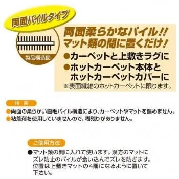 カーペットの間に置くだけでカーペット間のズレを防ぎます。柔らかな直毛パイルを採用していますのでカーペットを傷めません。