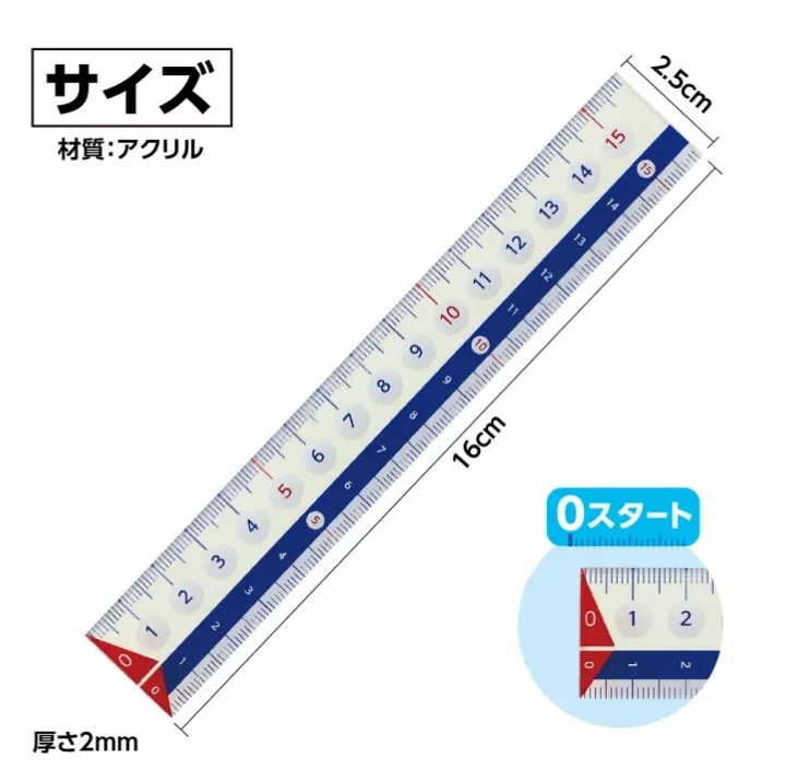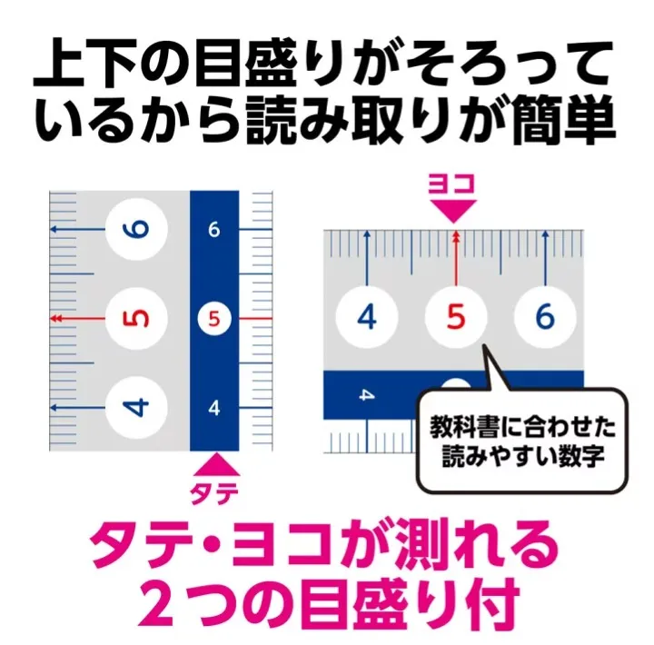 タテ,ヨコ両方の目盛りを備えており,算数や図形学習,図工など幅広い授業や宿題に安心して使える,使いやすさにこだわった定規です