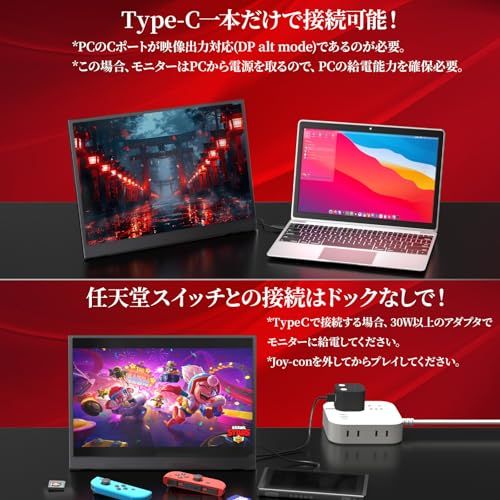 【TypeC一本だけで接続可・HDMIやDPも】miniHDMI、Type-C二つ搭載しているから、多様な接続方法を実現。一番便利なのは、Type-Cケーブル一本だけで映像出力と給電を同時に実現できます、しかも二つのType-C端子とも信号転送給電両対応。Type C端子で接続できない端末は、HDMI接続との選択肢があります。DP/miniDPしかない機種も、HDMIへ変換する変換器を付ければ大丈夫!※TypeCで接続するには、接続機器のCポートが映像出力(DP ALT MODE)に対応しなければなりません。