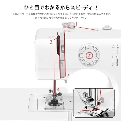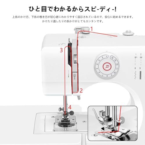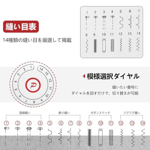 【12種類の縫い目】:地縫い、ジグジグ縫い、まつり縫い、ボタンホール、裾上げの用途に対応し、よく使う12種類の縫い目をダイヤルで回すだけで縫い模様の切替が可能。