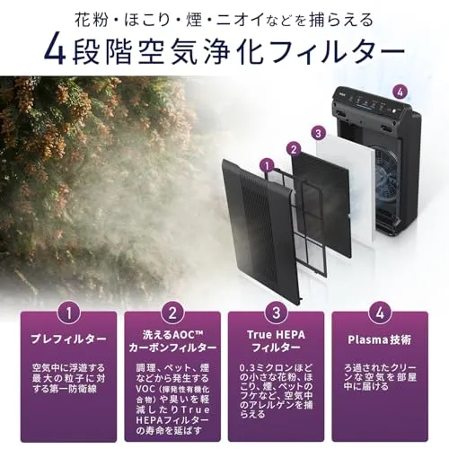 【4段階のフィルターで空気を徹底的に浄化】 微細なホコリを捕らえる微細メッシュプレフィルターから、花粉やPM2.5を除去するTrue HEPAフィルター、気になるニオイを吸着する活性炭フィルター、さらにウイルスや細菌を抑制し、空気中の不純物を効果的に取り除きます。※空気の浄化とは、無生物の粒子を除去することを意味します。