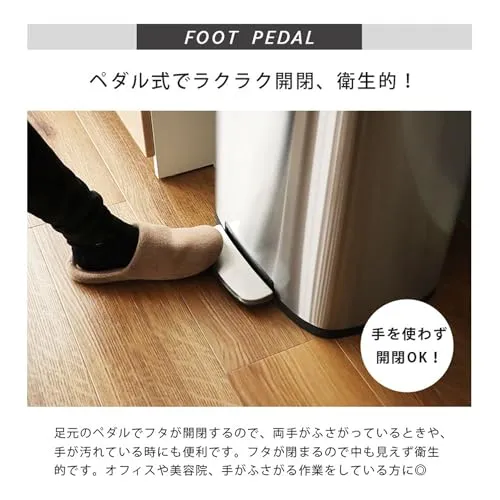 ?ふたの操作は多方向から踏みやすい楕円形のペダル形状。頻繁に開閉する上で求められる耐久性も備えます。開閉開閉手が塞がっていたり、手が汚れていてもごみを捨てやすい為、美容室やオフィスなどでの使用にも便利です