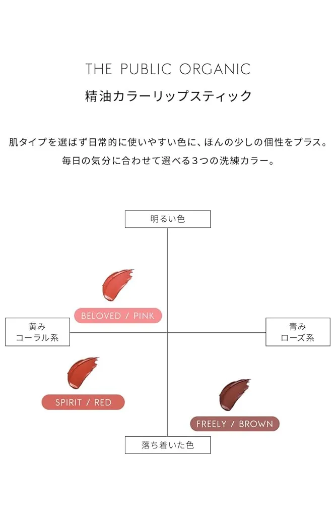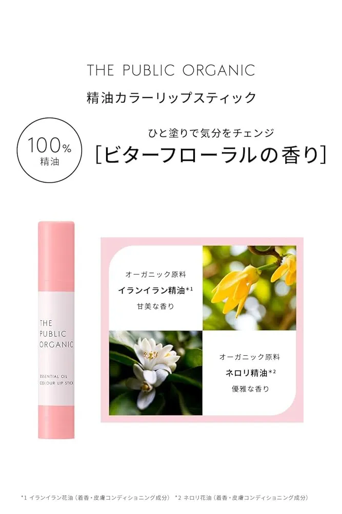 ヒマワリ種子油、ミツロウ、ヒマシ油*、ヤシ油*、ホホバ種子油*、シア脂*、イランイラン花油*、ビターオレンジ花油*、ニオイテンジクアオイ油*、ビターオレンジ葉/枝油*、プランクトンエキス、ブドウ種子油*、プルーン種子油*、オレンジ果皮油*、トコフェロール、ベルガモット果実油*、ホホバエステル、オクチルドデカノール、トリヒドロキシステアリン、アルミナ、シリカ、酸化チタン、酸化鉄、マンガンバイオレット(*オーガニック原料)