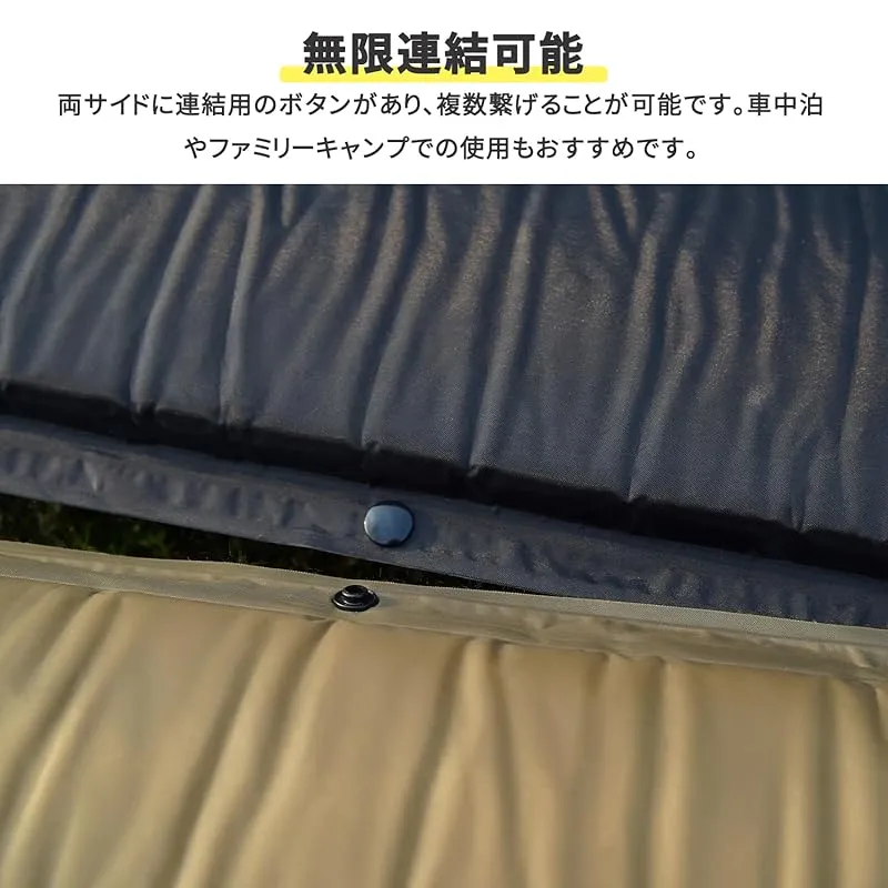 【連結可能】両サイドに連結用のボタンがあり複数枚繋げられるので、テント内で並べて使ったり、車中泊で並べて使うことが出来ます。
