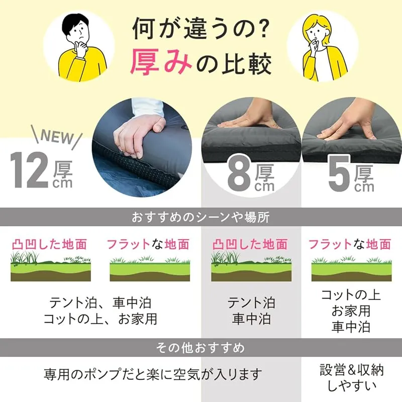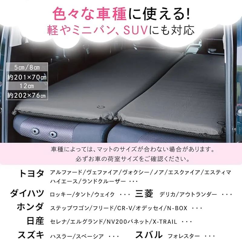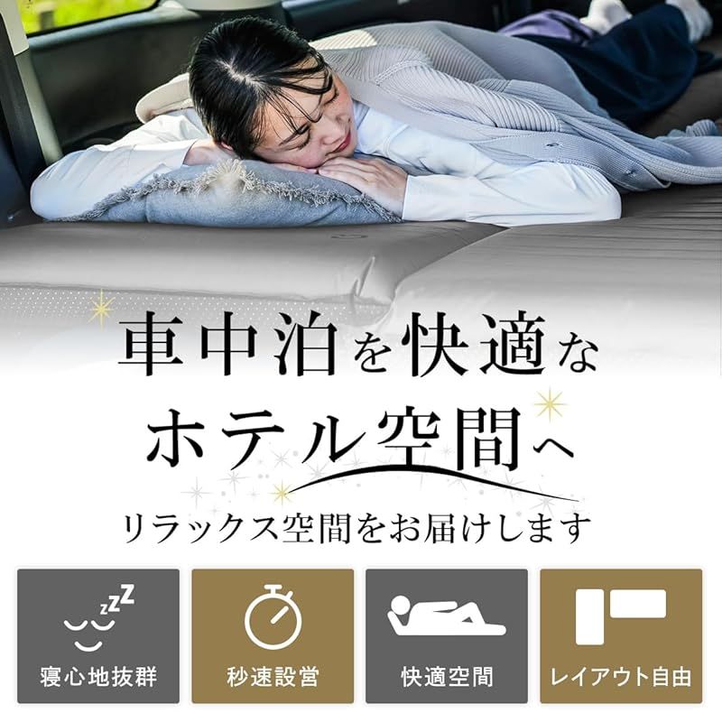 厚さ12cmの極厚高反発ウレタンで快適な寝心地を実現した車中泊マット。特大バルブで自動膨張し設営も簡単。車内の段差を解消し、キャンプや車中泊での睡眠の質を劇的に向上させます。裏面滑り止め加工済み。