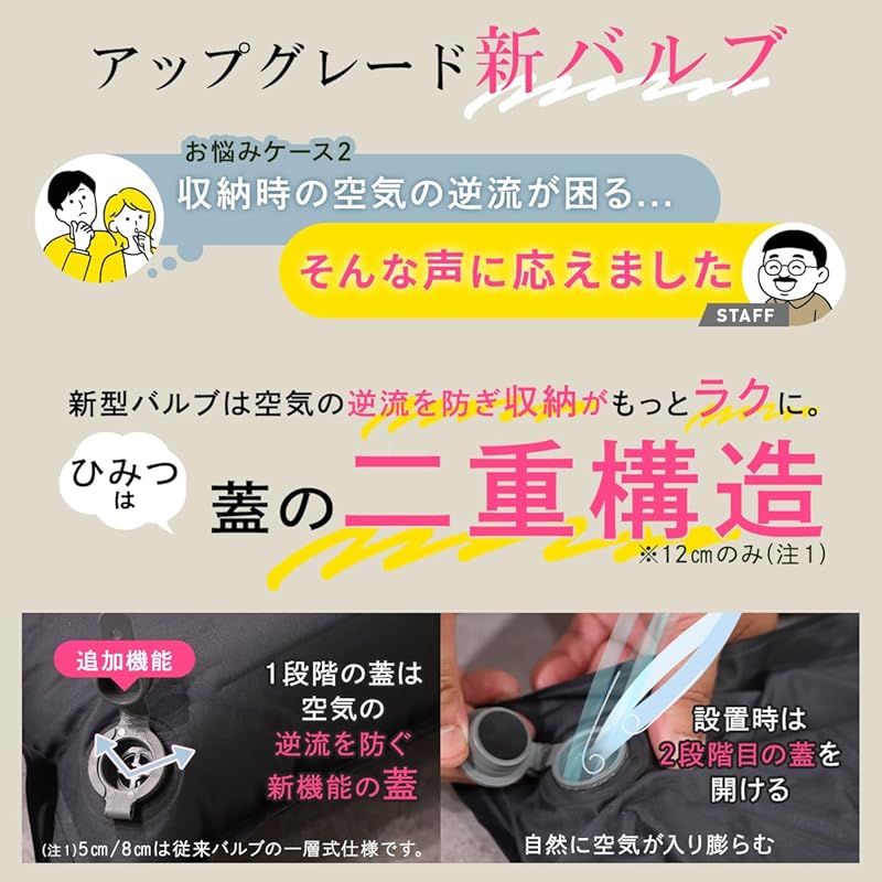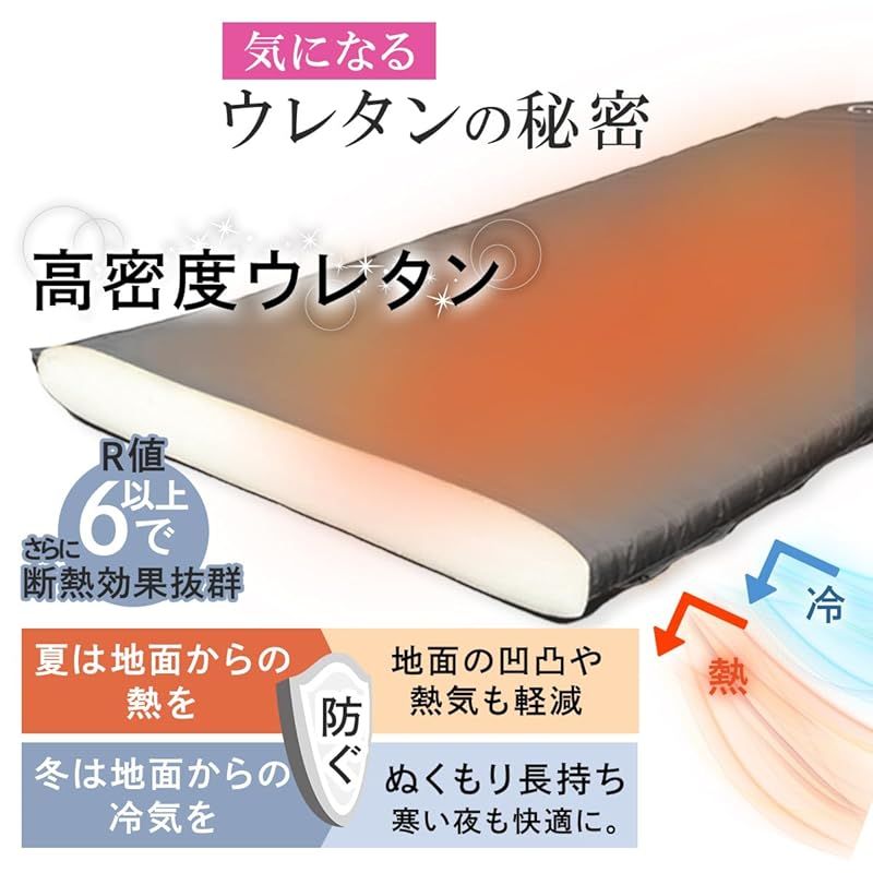 大型バルブと高密度ウレタン素材で広げるだけで自動膨張。2枚以上連結可能。