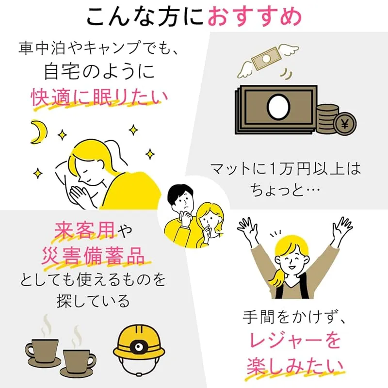 車内の段差や地面の凹凸をシャットダウン。急な来客や防災用マットとしても最適です。大型バルブと高密度ウレタン素材で広げるだけで自動膨張。2枚以上連結可能。