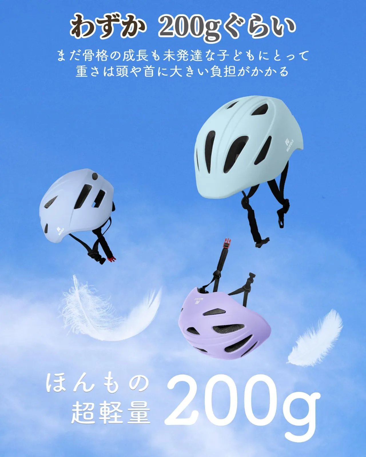 【ほんもの超軽量・わずか 200gぐらい】まだ骨格の成長も未発達な幼児にとって、実は市販のへルメットってお子さんにとっては重たいんです。子供の頭や首に大きい負担がかかないために、超軽量のモデルを開発しました。Sサイズはわずか 215gくらい、Mサイズもただ 225gくらいので、長い装着時間でも頭に負担や痛みを与えているからといって子供に嫌われることはありません。ヘルメットのことを子供に好きにさせ、ヘルメットで安全を守らせます。