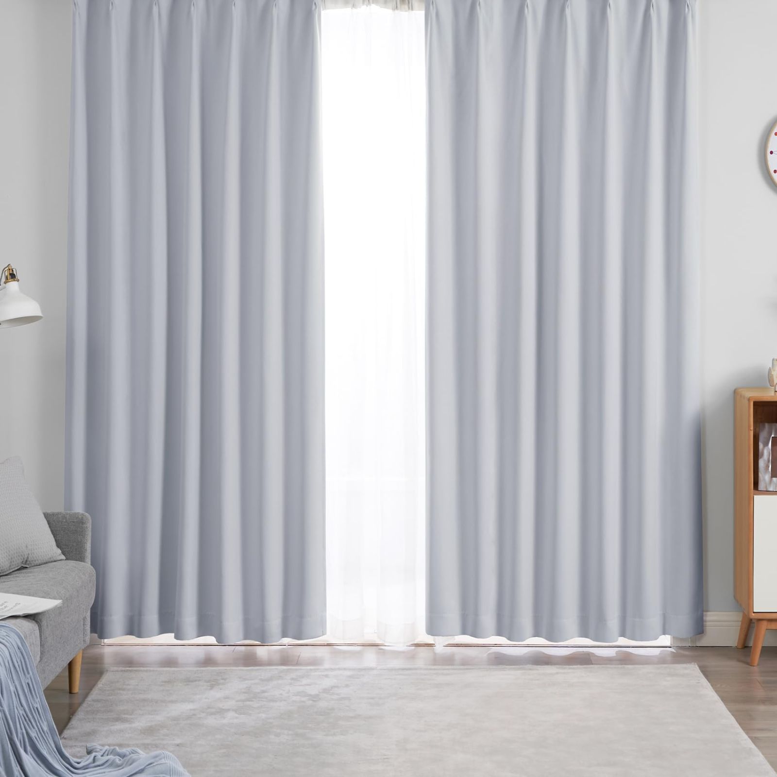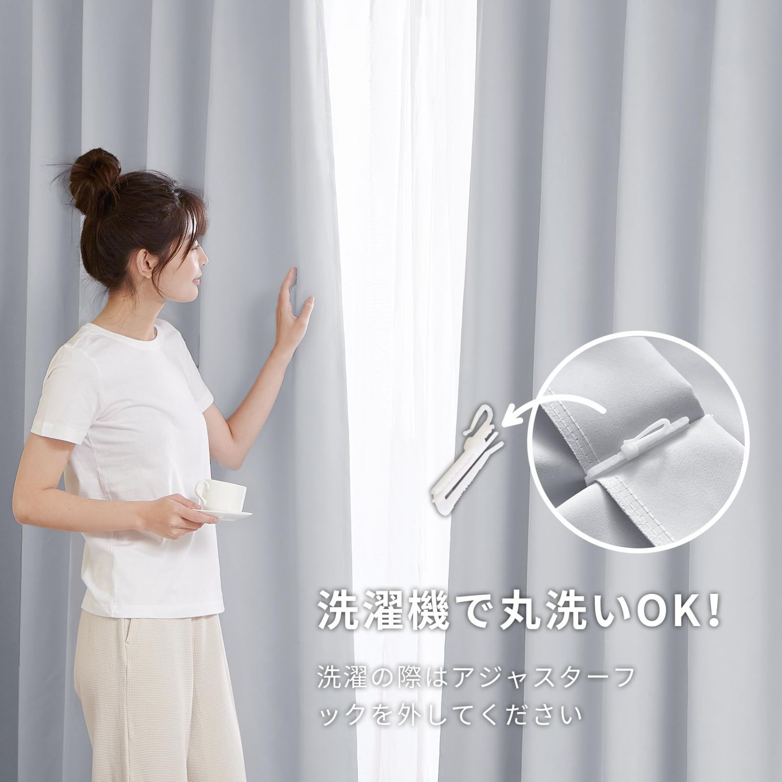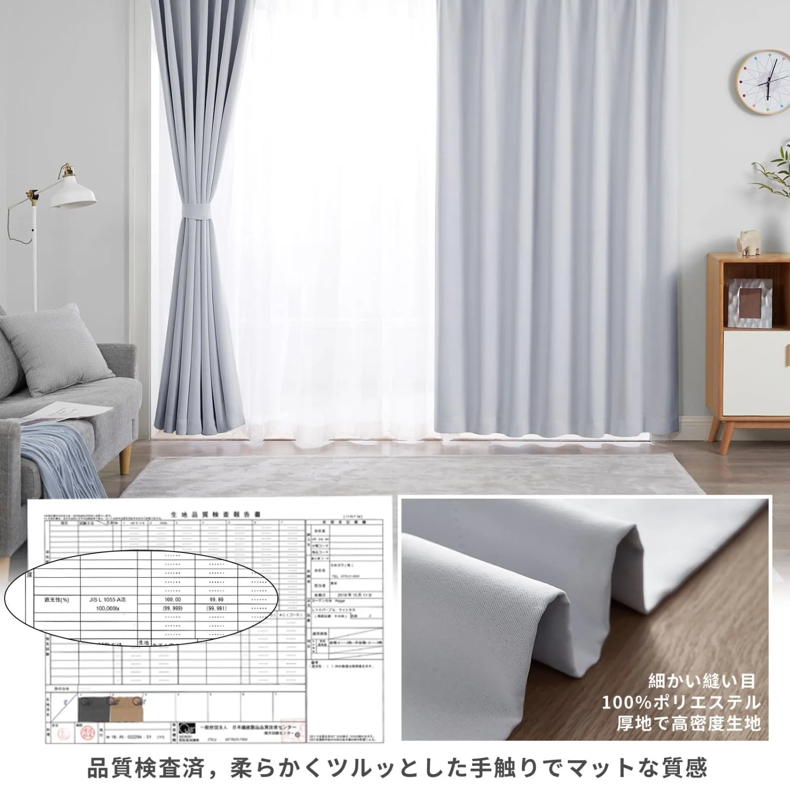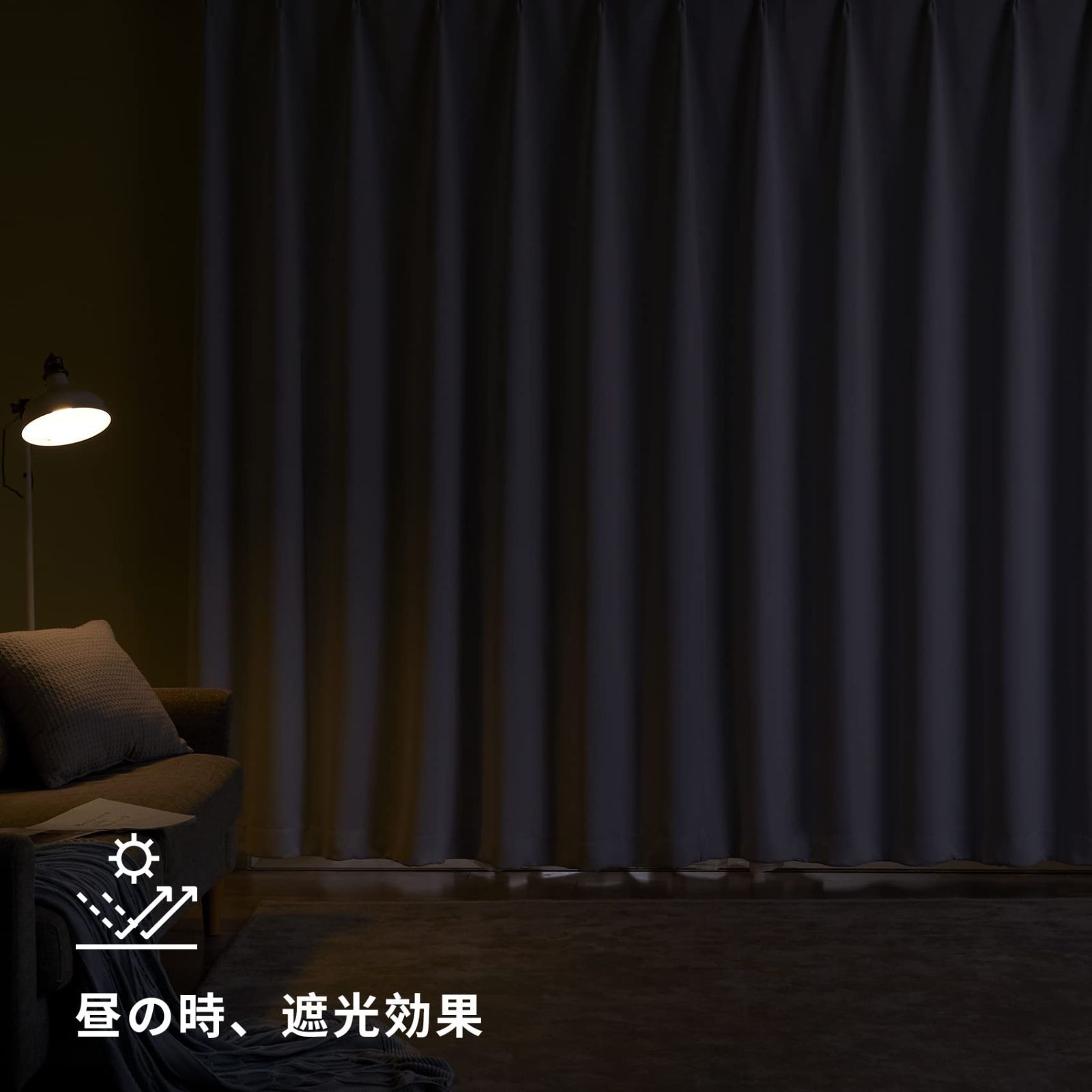 【一級遮光】このカーテンは遮光度が99.99%以上,外からの光をほとんど通さないため、昼間カーテンを閉めたお部屋のなかで相手の顔の表情が分からない程度にまでお部屋を暗くできます。同じ等級であっても、カーテンの明度や色彩によって遮光の度合いが変わります。薄い淡い色は光を通しやすく、濃い暗い色は光を通しにくいです。遮光性を重視される方は濃色をおすすめします。