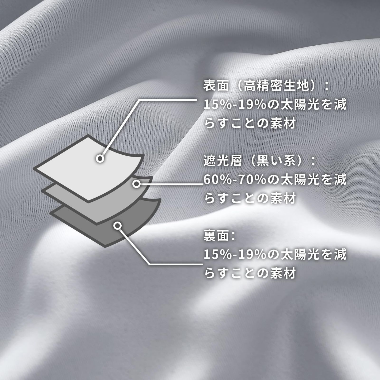 【三重織り技術】生地は三重構造のテクノロジーの技術利用して黒い系を織り込んでいるから、優れた遮光機能が備えております。きちんと室外からの日差しや紫外線などをしっかり遮られる機能付きの厚地遮光カーテンです。