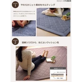 デニム調のキルティングラグカーペットです。キルティング加工をすることで、中綿が寄ったりズレたりしにくくなります。表地にはしなやかで伸縮性のある生地を使用しています。とても柔らかくソフトな風合いです。