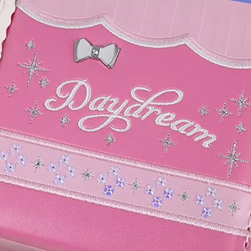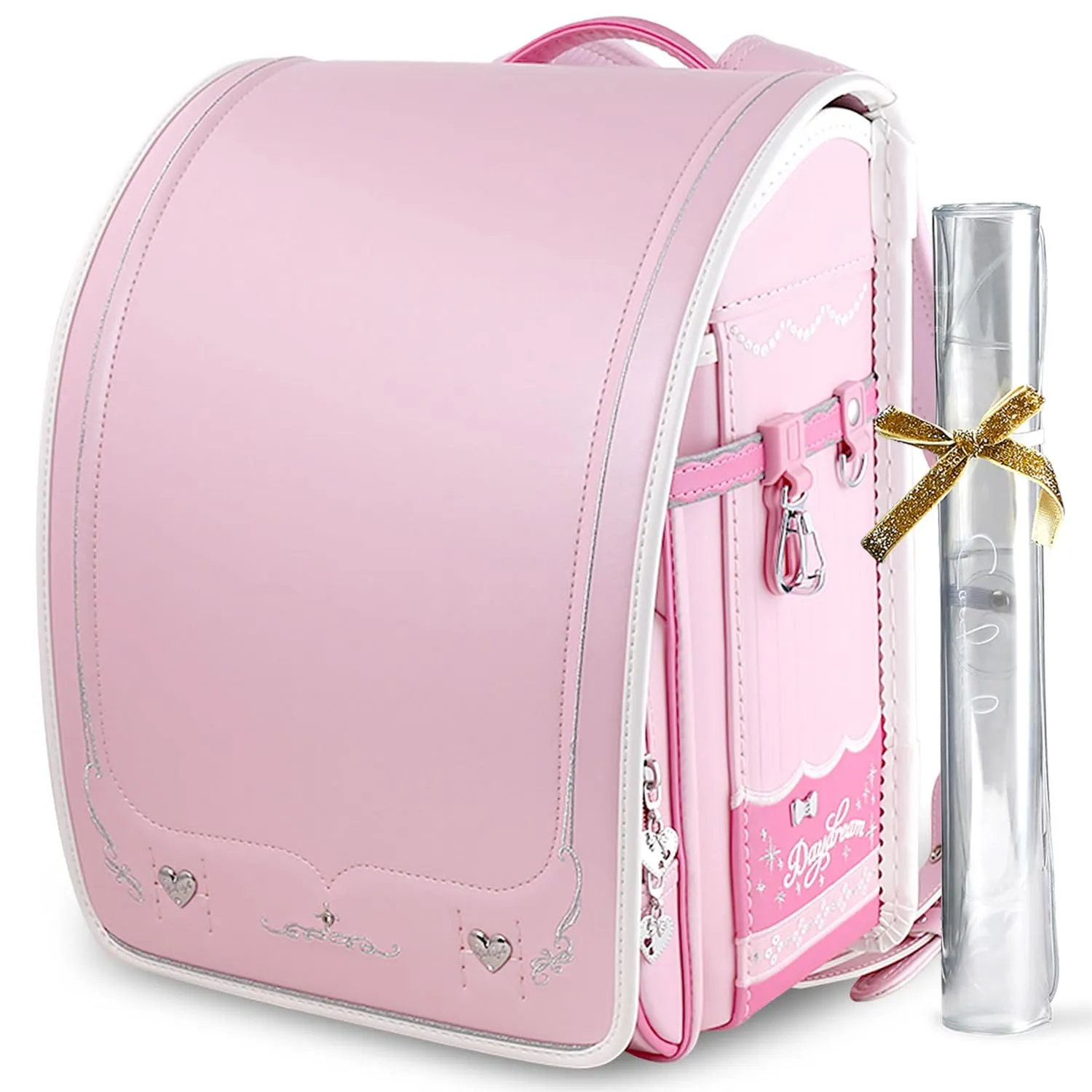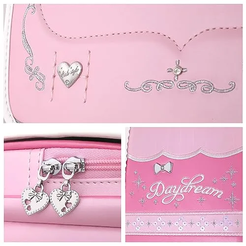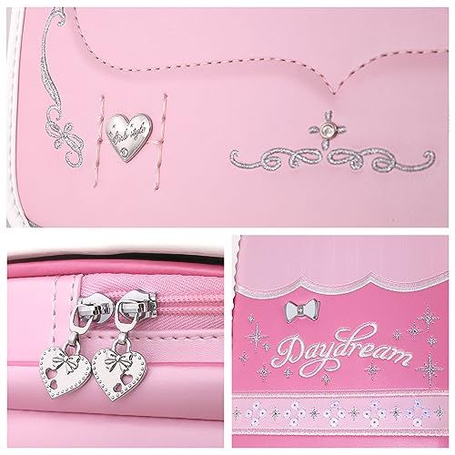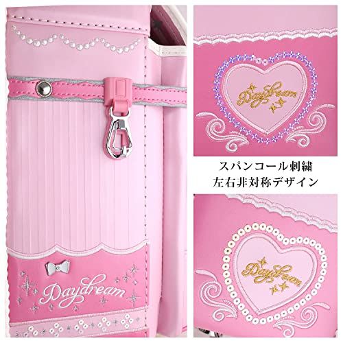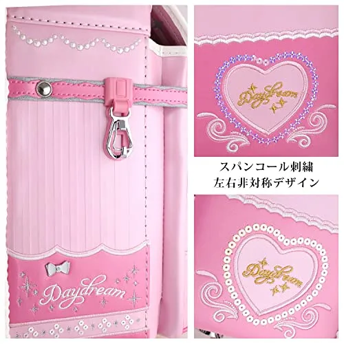 スパンコール刺繍デザインを採用した最新技術。七色のスパンコールがランドセルにあしらわれ、角度によって異なる光沢が反射され、そして反射型のエンボス模様と呼応する。華麗で堂々としたさまをさした。すべての女の子の夢の中のかばんです。