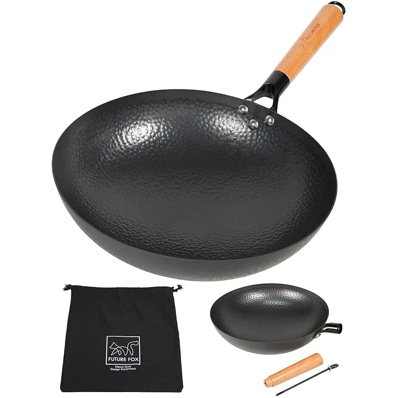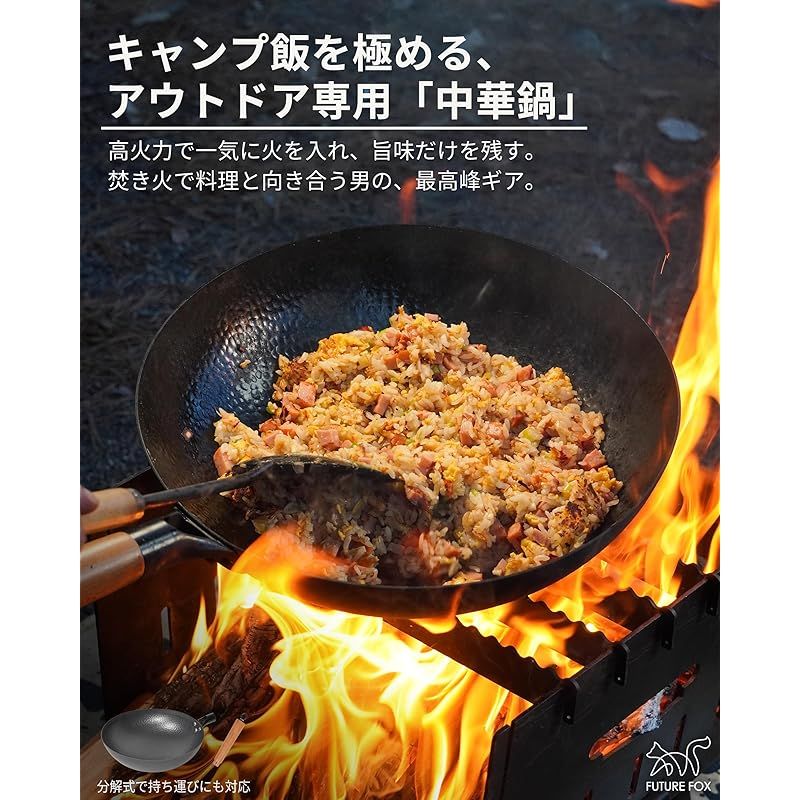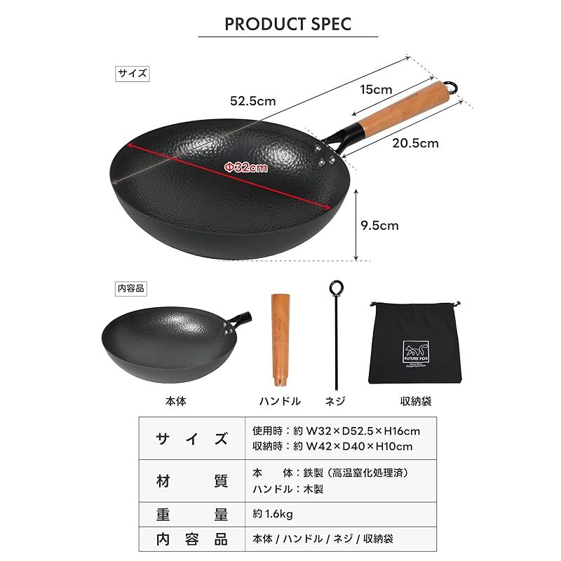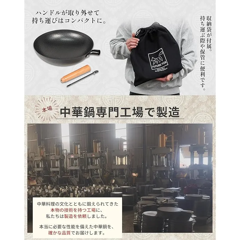 商品名:FUTUREFOX アウトドア専用 中華鍋 直径32cm 深型 取っ手が取れる 窒化処理 直火対応 空焼き/シーズニング不要 手入れ簡単