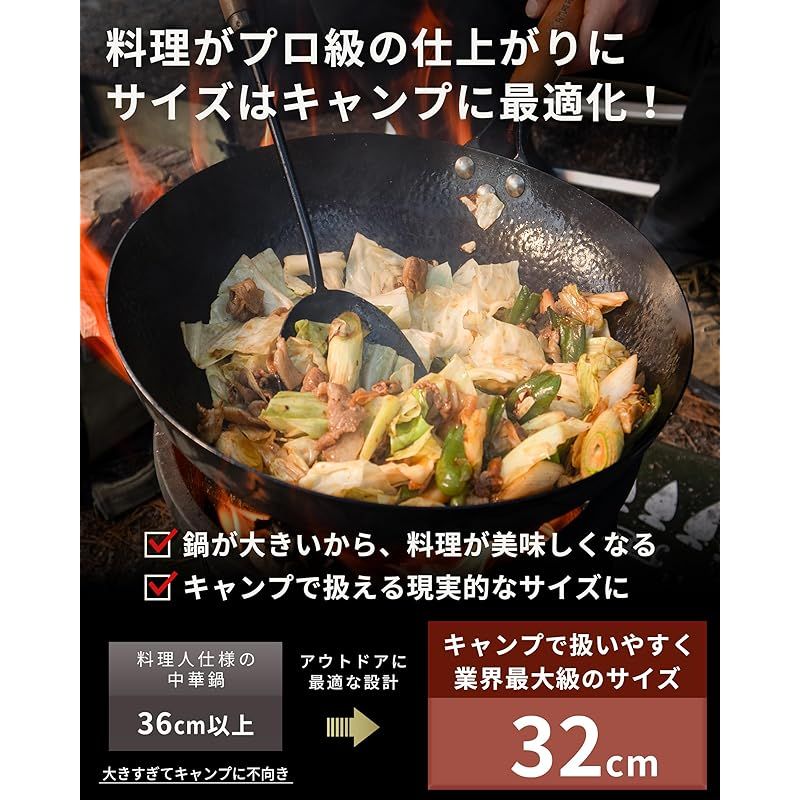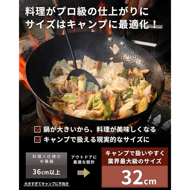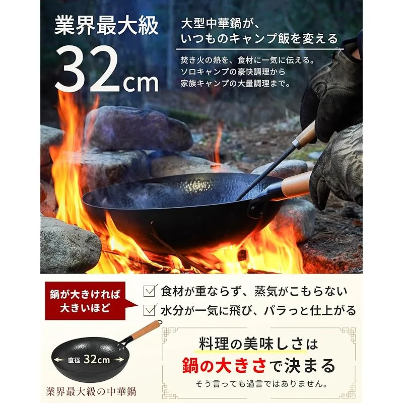 【直径32cmの大型中華鍋|キャンプでプロ級の料理が楽しめる!】 ??直径32cmの大型サイズにより、キャンプ用中華鍋の中でもトップクラスの調理面積を確保。食材が重なりにくく、蒸気がこもらないため、炒飯はパラっと、野菜はシャキッとした中華料理特有の仕上がりを実現します。キャンプやアウトドアで「フライパンでは物足りない」と感じていた方に最適な、本格鉄製中華鍋です。