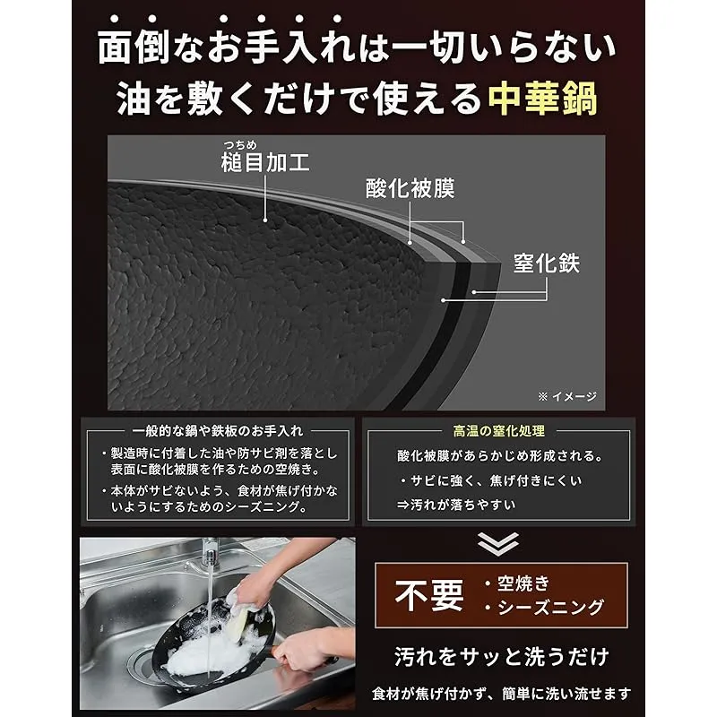 【シーズニング不要|窒化処理で空焼きいらず】 ??高温窒化処理を施すことで、鉄の表面に油がなじみやすい酸化被膜を形成。通常の鉄鍋に必要な空焼きや油ならしをしなくても、届いたその日からすぐに使える設計です。「中華鍋は手入れが面倒」というイメージを覆す、初心者にもやさしいアウトドア用中華鍋です。