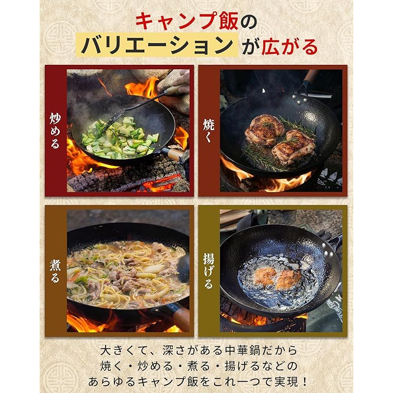 【直火・焚き火対応|アウトドア専用設計】 ??ガスバーナーはもちろん、焚き火の強火にも対応する鉄製中華鍋。家庭用IH対応鍋では味わえない高火力調理が可能で、アウトドアでも中華料理本来の「強火で一気に仕上げる」火入れを楽しめます。キャンプ、BBQ、野外調理に最適です。※IH調理には対応しておりません。