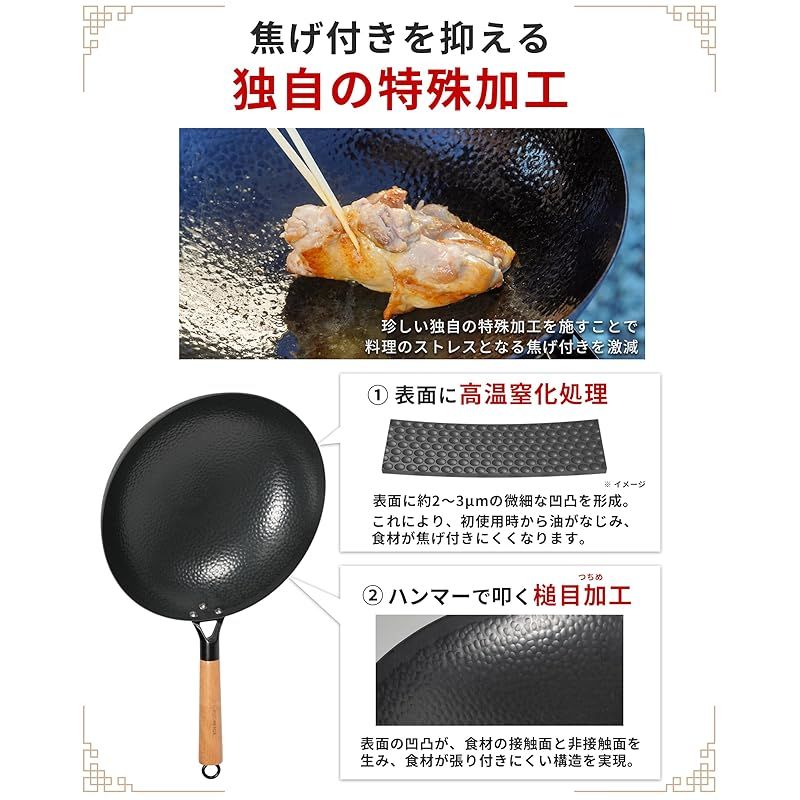 【サビに強く長く使える窒化鉄】 ??窒化処理によって鉄の表面硬度と耐食性を高め、サビにくく劣化しにくい構造に。キャンプやアウトドアで繰り返し使っても性能が落ちにくく、長く愛用できる中華鍋です。
