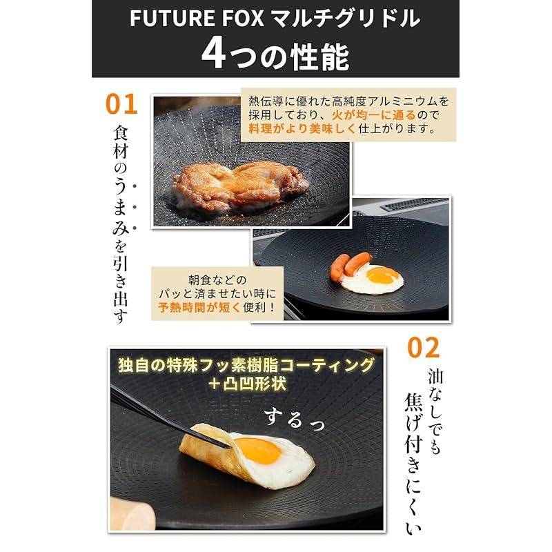【特殊フッ素樹脂コーティング】??マルチグリドルの表面には、特殊フッ素樹脂コーティングを施しており、焦げ付きにくく、油をひかずに調理が可能。焼き肉や野菜炒め、魚料理などもくっつかずにスムーズに調理でき、片付けも簡単です。FUTURE FOXのマルチグリドルなら、アウトドアでも家庭でも、気軽に手軽に調理が楽しめます。