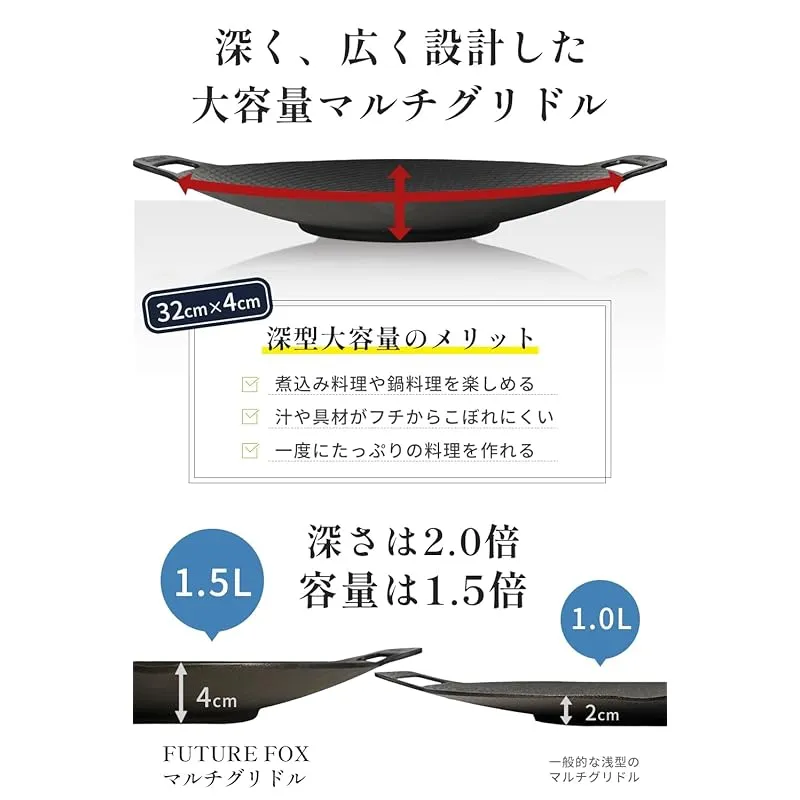 【業界トップクラスの深さを実現】??FUTURE FOXのマルチグリドルは深さ4cmに設計したことで、水分の多い煮込み料理や鍋料理も楽しめるようになりました。深型なのでキャンプでもこぼれる心配がなく、安心して豪快な料理が楽しめます。深さを生かした本格キャンプ飯を、アウトドアシーンで気軽に実現できるのがこのマルチグリドルの魅力です。