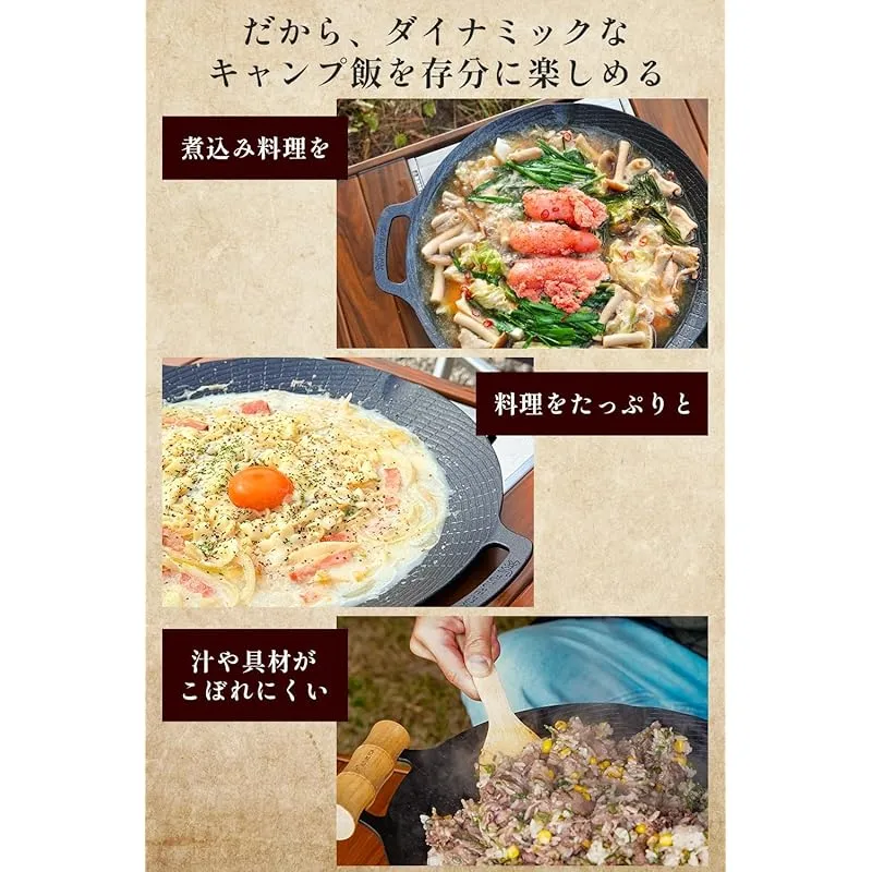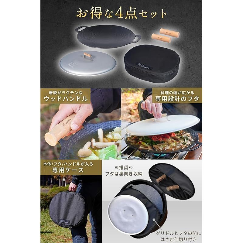 【必要なものを全てセットでお届け】??専用のフタ、ウッドハンドル、専用収納ケースが付属しており、購入後すぐに使えるオールインワンパッケージです。専用の収納袋付きで持ち運びがしやすく、アウトドアでも家庭でも気軽に調理できるのが大きな特長。
