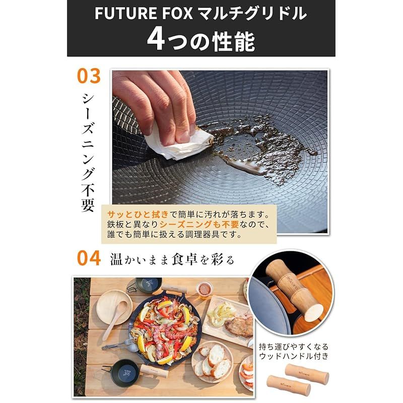 【あらゆる調理方法に対応】??フューチャーフォックス マルチグリドルは、焼く、炒める、煮る、揚げる、蒸すといった多彩な調理が可能な万能調理器具です。キャンプやアウトドアで料理の幅が広がり、シンプルでありながら幅広い料理に対応。幅広いメニューを一台で作れるマルチグリドルは、料理好きなキャンパーやアウトドア愛好者にぴったりのアイテムです。