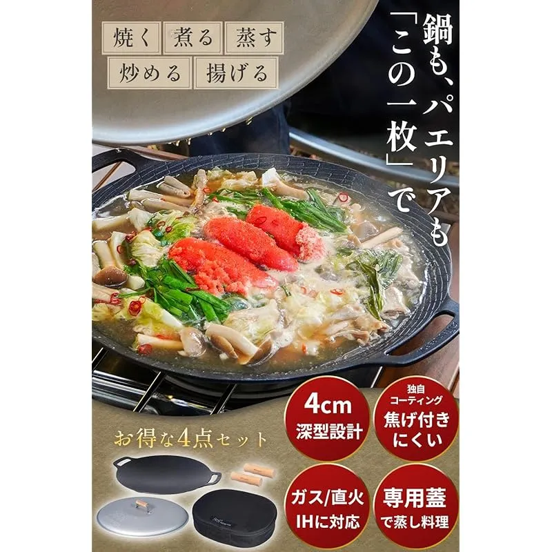 商品名:FUTUREFOX マルチグリドル 鉄板 深さ4cm 深型 直径32cm 蓋付き 4点セット (本体+蓋+ハンドル+収納ケース)
