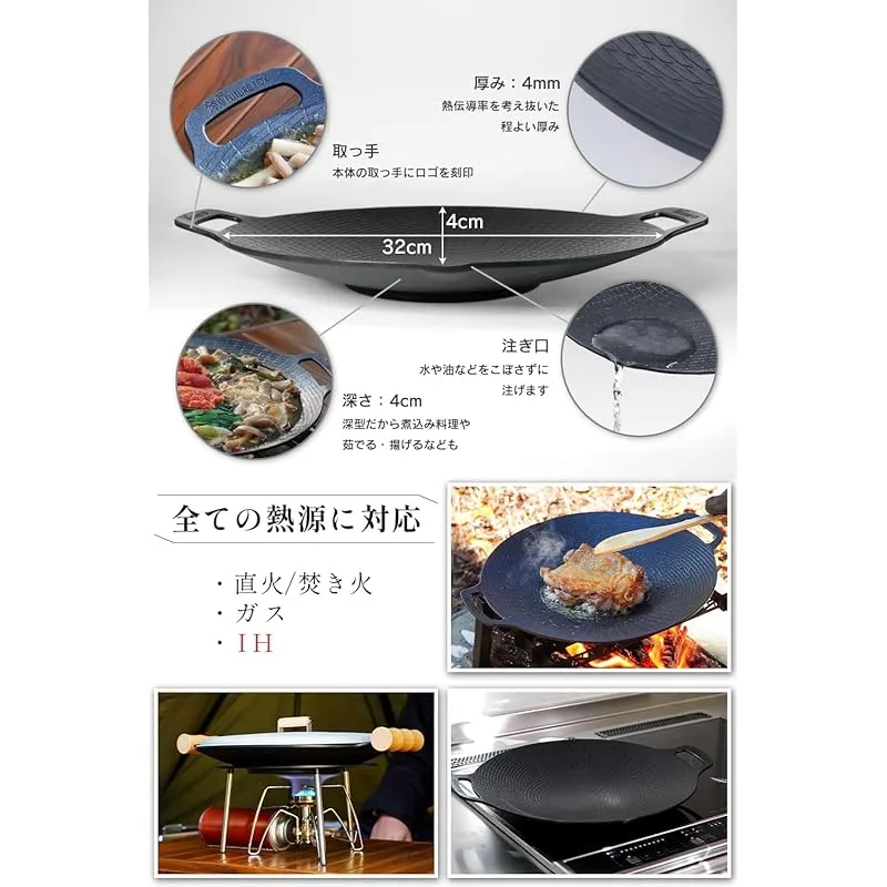 【直火・ガス・IH対応】??直火、ガス、IHなどあらゆる熱源に対応しています。キャンプの焚き火やガスコンロ、家庭のIH調理器でも使えるため、家庭用としても便利で、様々な調理シーンでの活躍が期待できます。