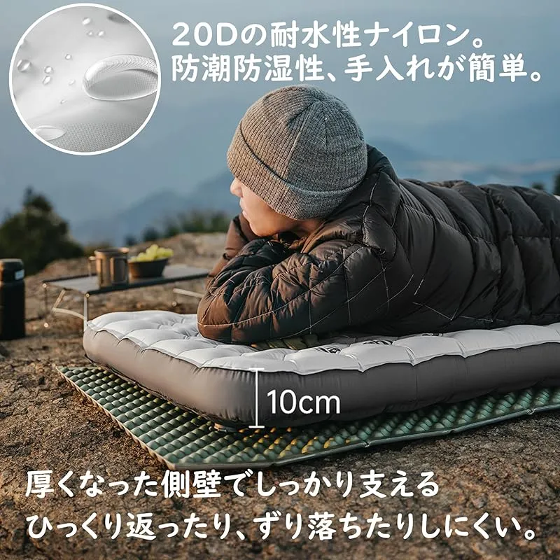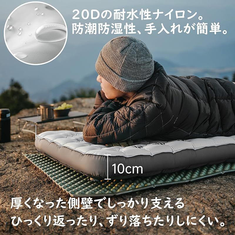 【しっかりとした支え】10cmの厚さのこの空気ベットは、側壁の設計、表面スポット溶接プロセス、圧力の均一な分散と、強力なサポートを提供し、側壁のない従来のエアクッションに比べて、厚くなり、寝返りが滑りにくくなっています。 エアクッションは、20D防水ナイロン素材で作られており、防潮防湿、手入れが簡単です。