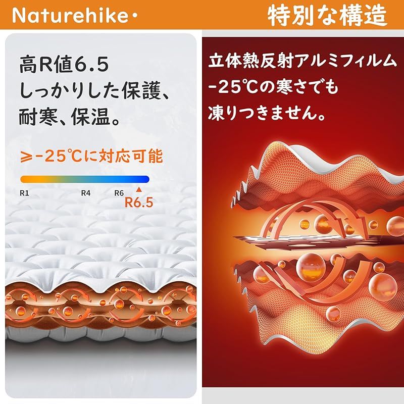 【耐寒保温構造】このNaturehikeエアーマットはNKTR(熱反射システム)を採用しています:多層複合アルミフィルムによる立体熱反射構造が熱循環をもたらし、身体から地面への熱損失を抑え、背中の冷えを防ぐことができます。しっかりとした保護が、このインフレーターマットを-25℃以上に使用でき、耐寒保温。