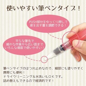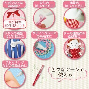 細部に塗りやすく、携帯に便利な筆ペンタイプのほつれ止めです。ドライクリーニング、水洗いOK。リボンや生地の端、ボタン付け糸のほどけ防止、タティングレースの糸始末、ドール服の端処理など色々な場面でお使いいただけます。