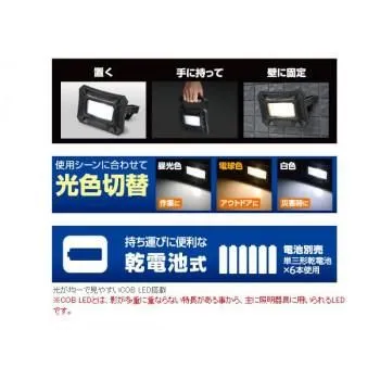 使用シーンに合わせて光色を「昼光色→電球色→白色」に切り替えできます。広く明るく照らすことができ、屋外でも使用できるので、アウトドアや夜間作業に便利です。