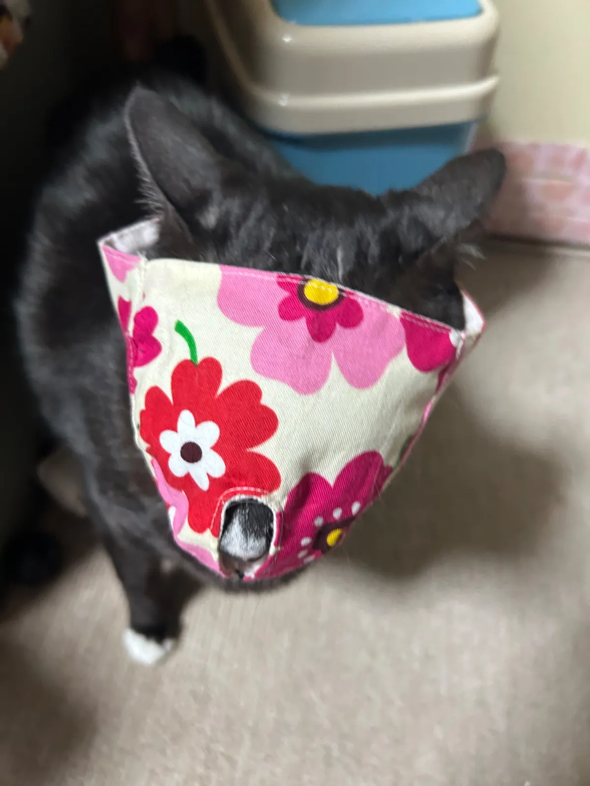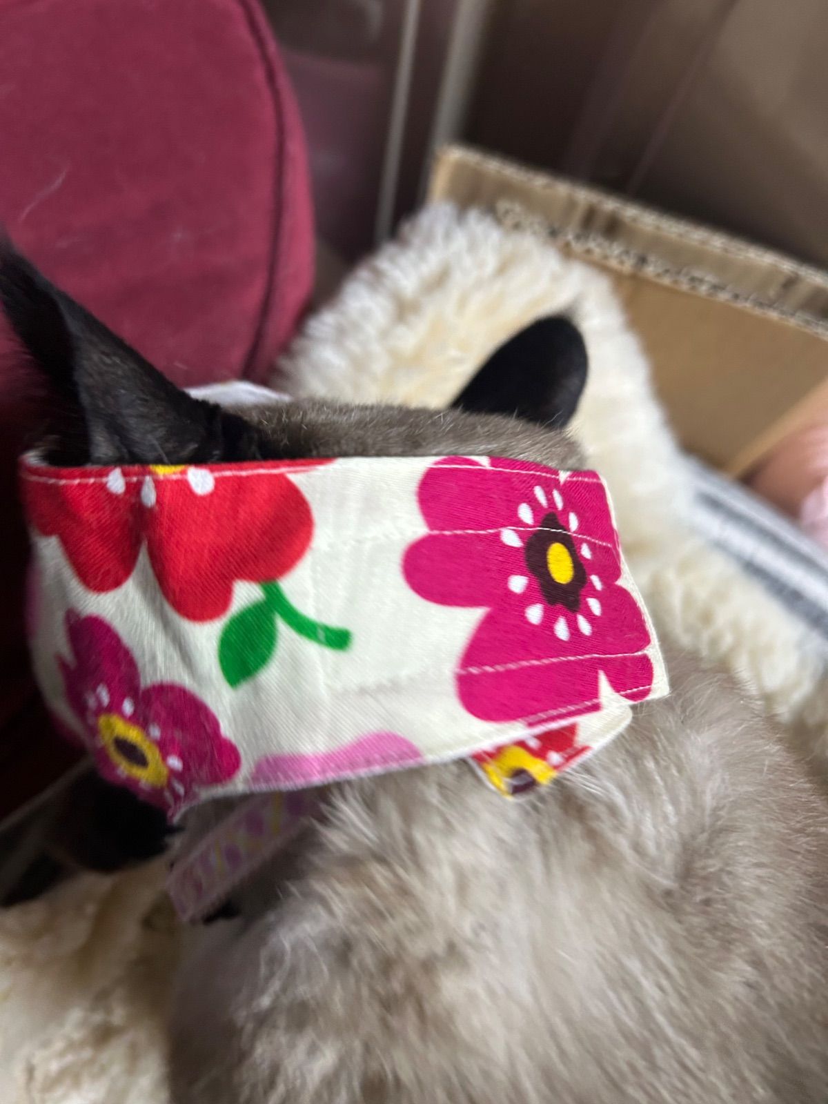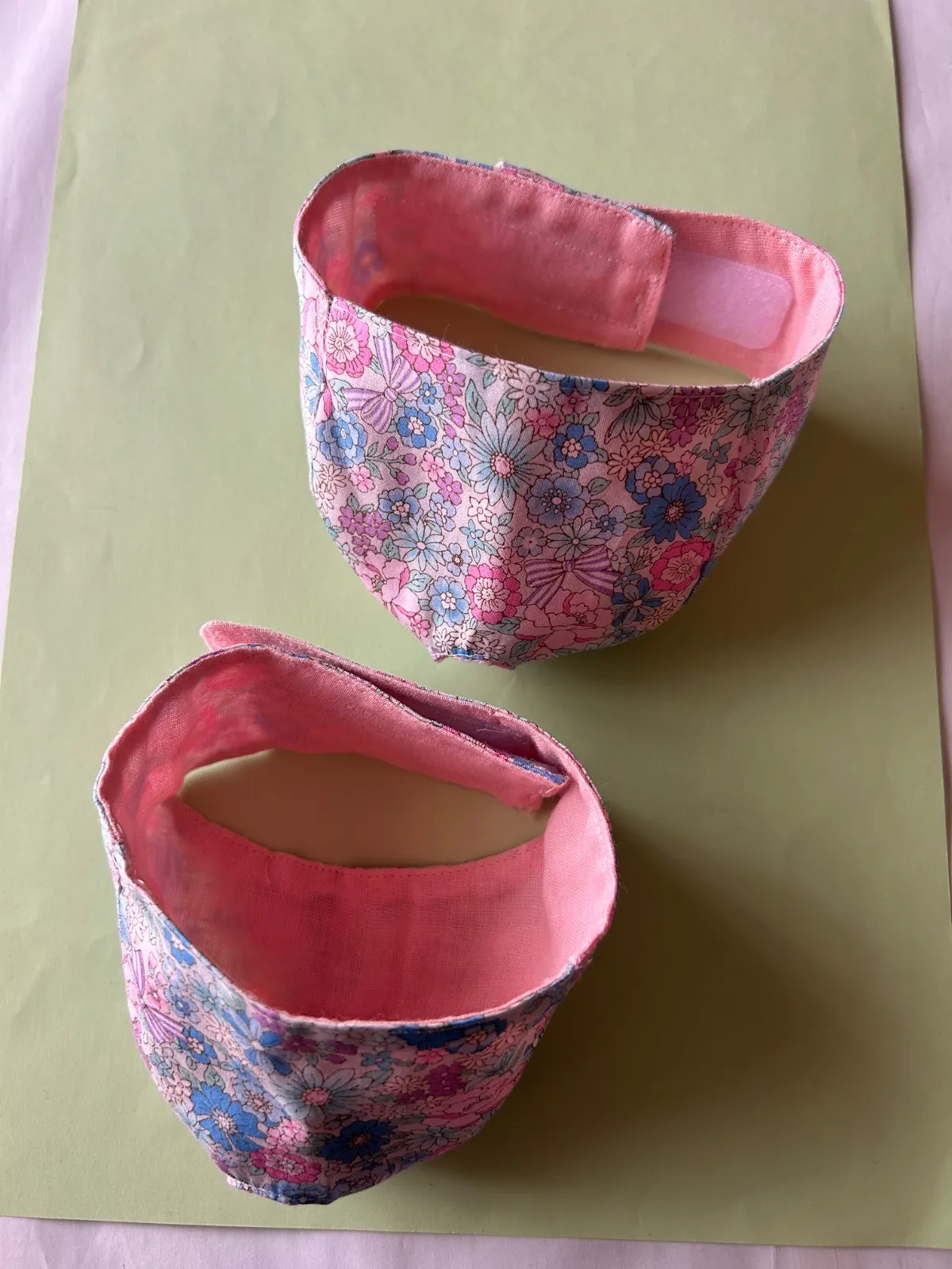 猫ちゃんの爪切りの時の目隠しマスク ハンドメイドMサイズ1枚 着脱はマジックテープで簡単です サイズ調整出来ます 目は隠して鼻と口が見えるタイプ 表綿布 裏側猫ちゃんの顔があたる方はガーゼ 前方から静かにかぶせて強くしめすぎないように してくださいね たまにマスクがキライな猫ちゃんもいるかも しれませんがお試しに使って見てください 画像5が小さくなった大きさと大きくなった型です 補助マスクMサイズの画像 6〜13我が家の猫着用画像参考に見てください 体重4キロメス、体重6キロオスの猫参考です