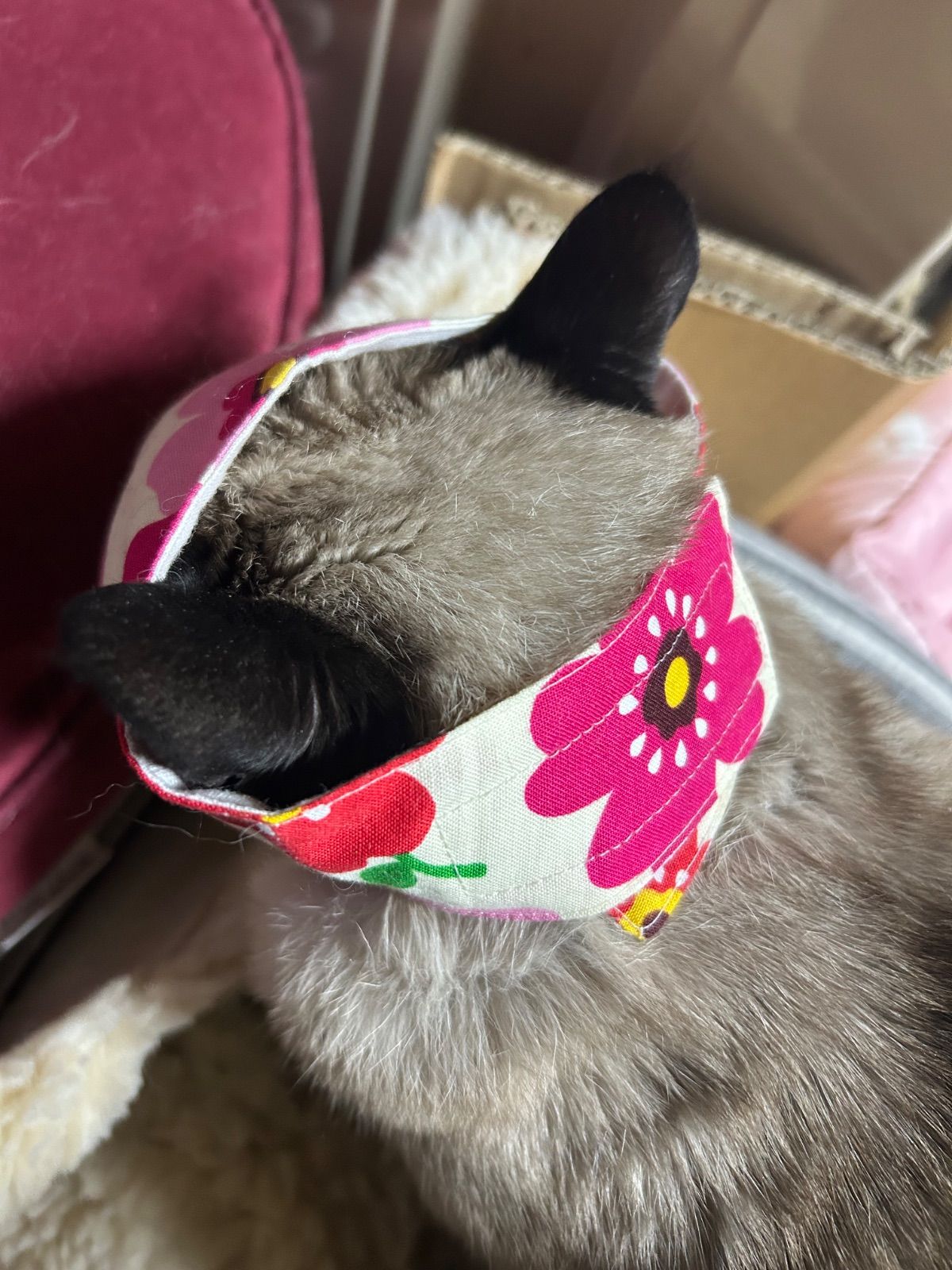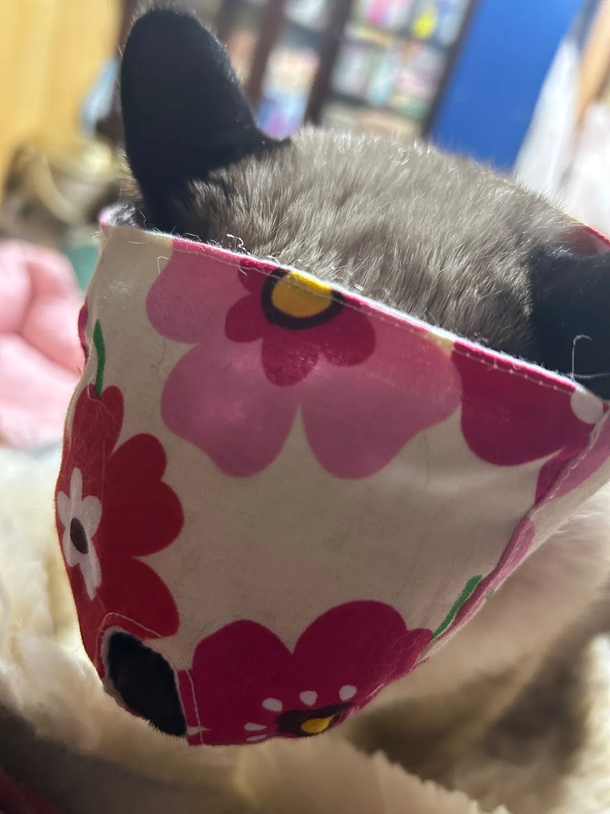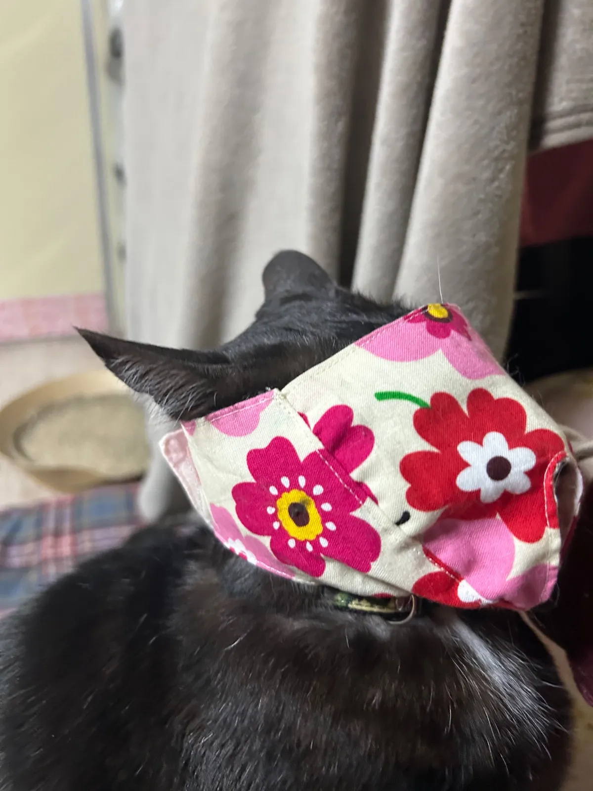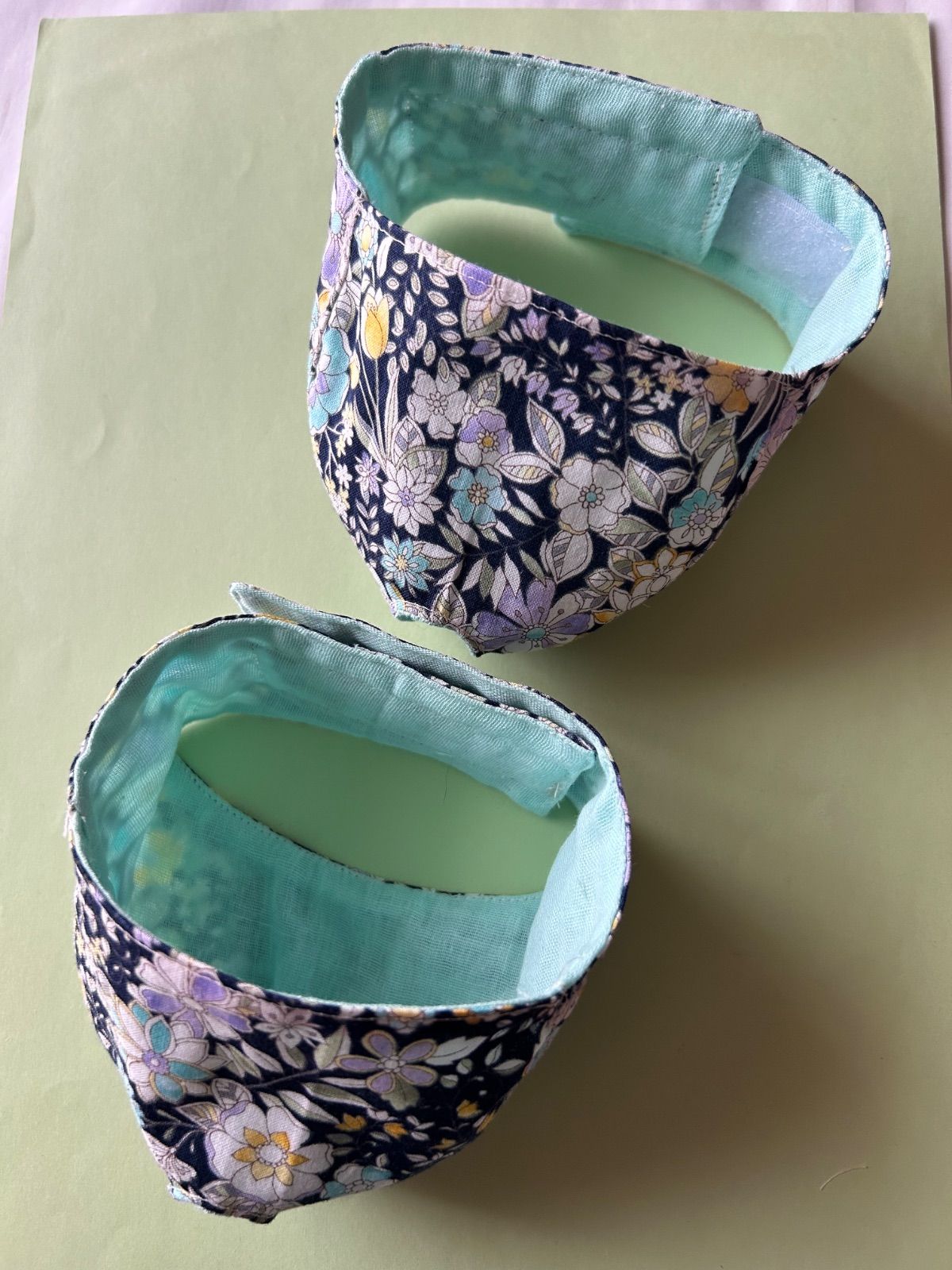 猫ちゃんの爪切りの時の目隠しマスク ハンドメイドMサイズ1枚 着脱はマジックテープで簡単です サイズ調整出来ます 目は隠して鼻と口が見えるタイプ 表綿布 裏側猫ちゃんの顔があたる方はガーゼ 前方から静かにかぶせて強くしめすぎないように してくださいね たまにマスクがキライな猫ちゃんもいるかも しれませんがお試しに使って見てください 画像5が小さくなった大きさと大きくなった型です 補助マスクMサイズの画像 6〜13我が家の猫着用画像参考に見てください 体重4キロメス、体重6キロオスの猫参考です