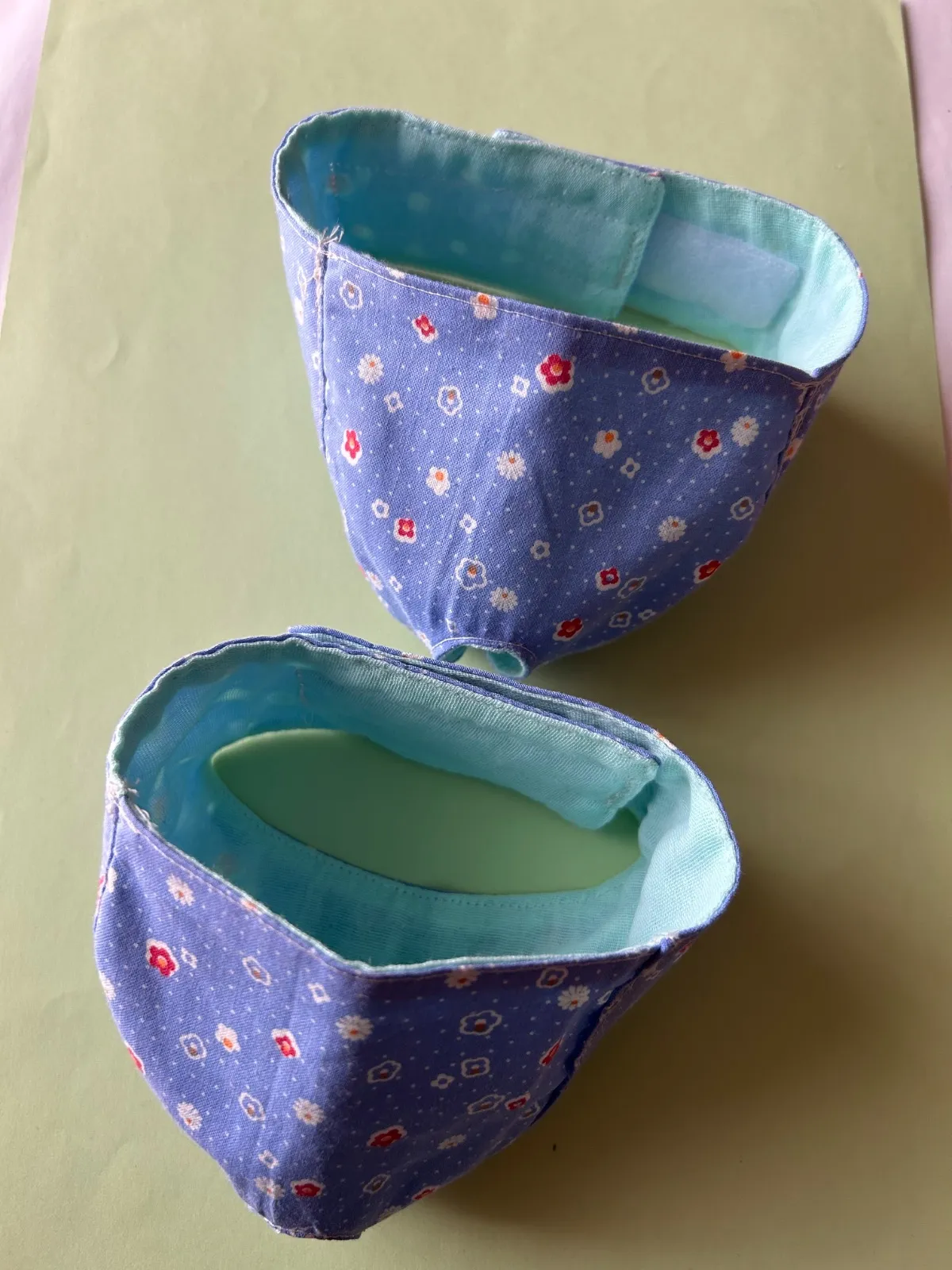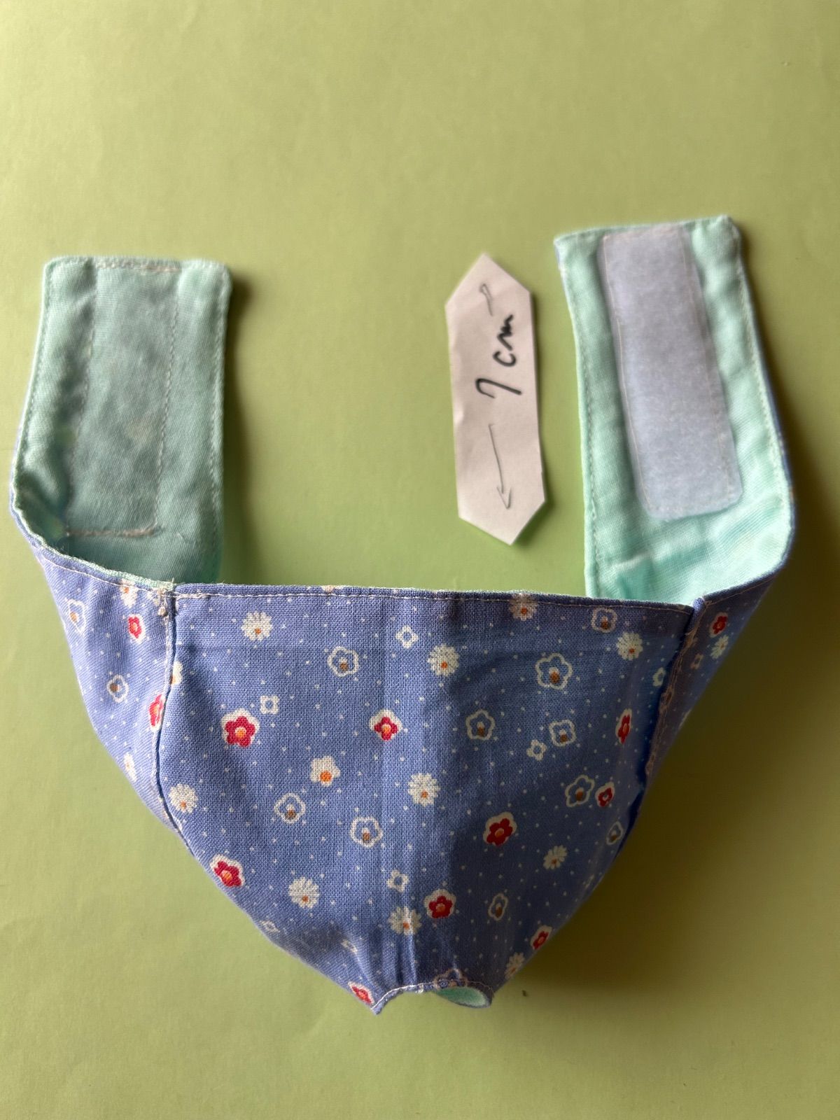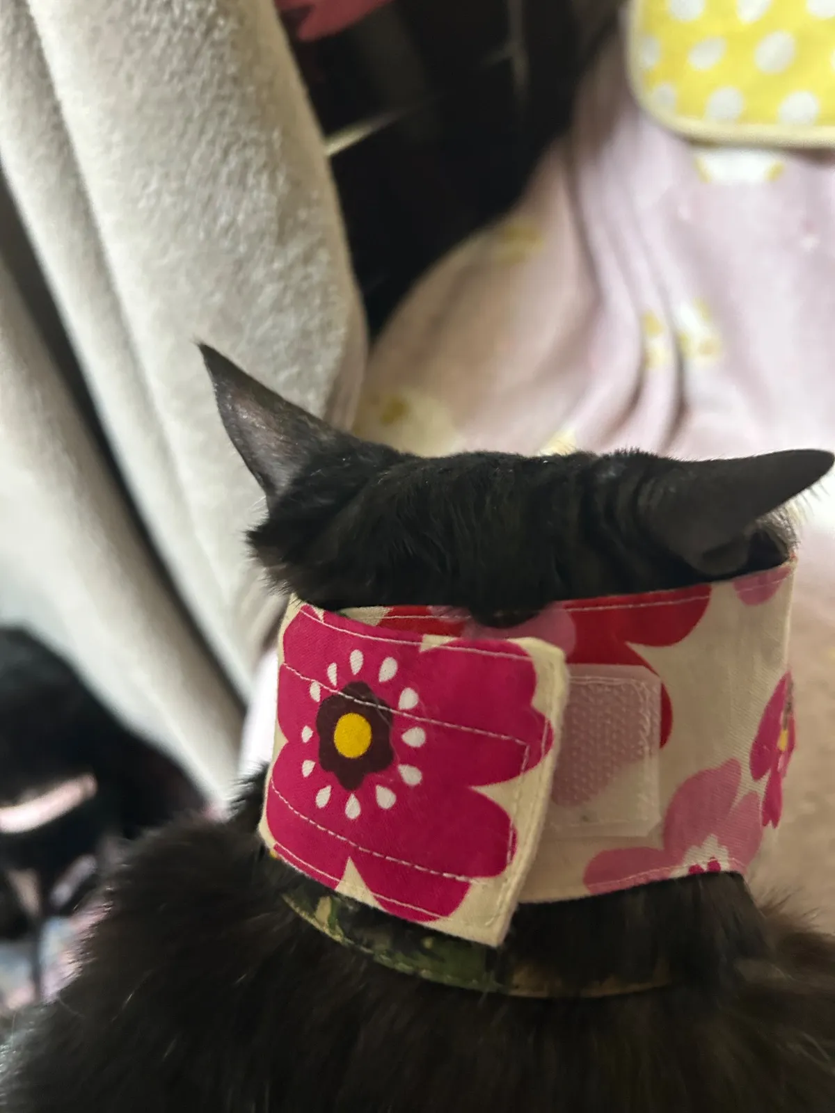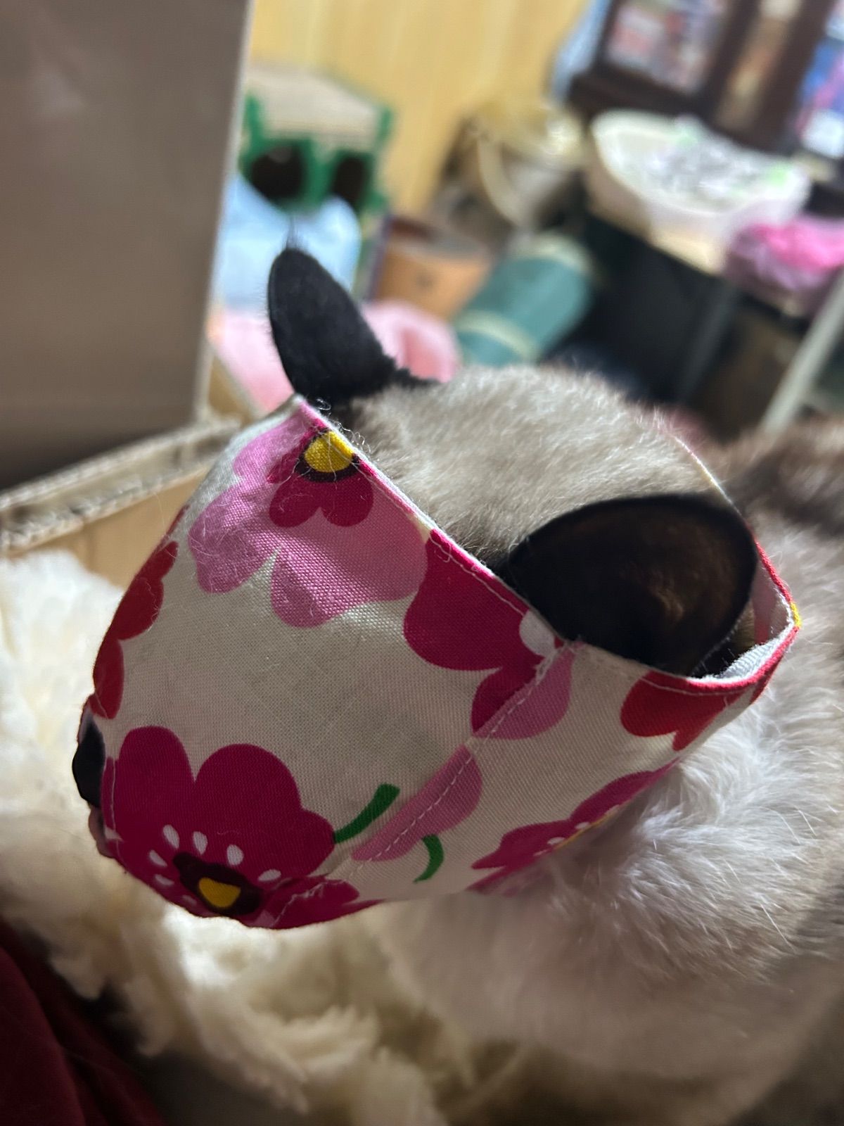 猫ちゃんの爪切りの時の目隠しマスク ハンドメイドMサイズ1枚 着脱はマジックテープで簡単です サイズ調整出来ます 目は隠して鼻と口が見えるタイプ 表綿布 裏側猫ちゃんの顔があたる方はガーゼ 前方から静かにかぶせて強くしめすぎないように してくださいね たまにマスクがキライな猫ちゃんもいるかも しれませんがお試しに使って見てください 画像5が小さくなった大きさと大きくなった型です 補助マスクMサイズの画像 6〜13我が家の猫着用画像参考に見てください 体重4キロメス、体重6キロオスの猫参考です