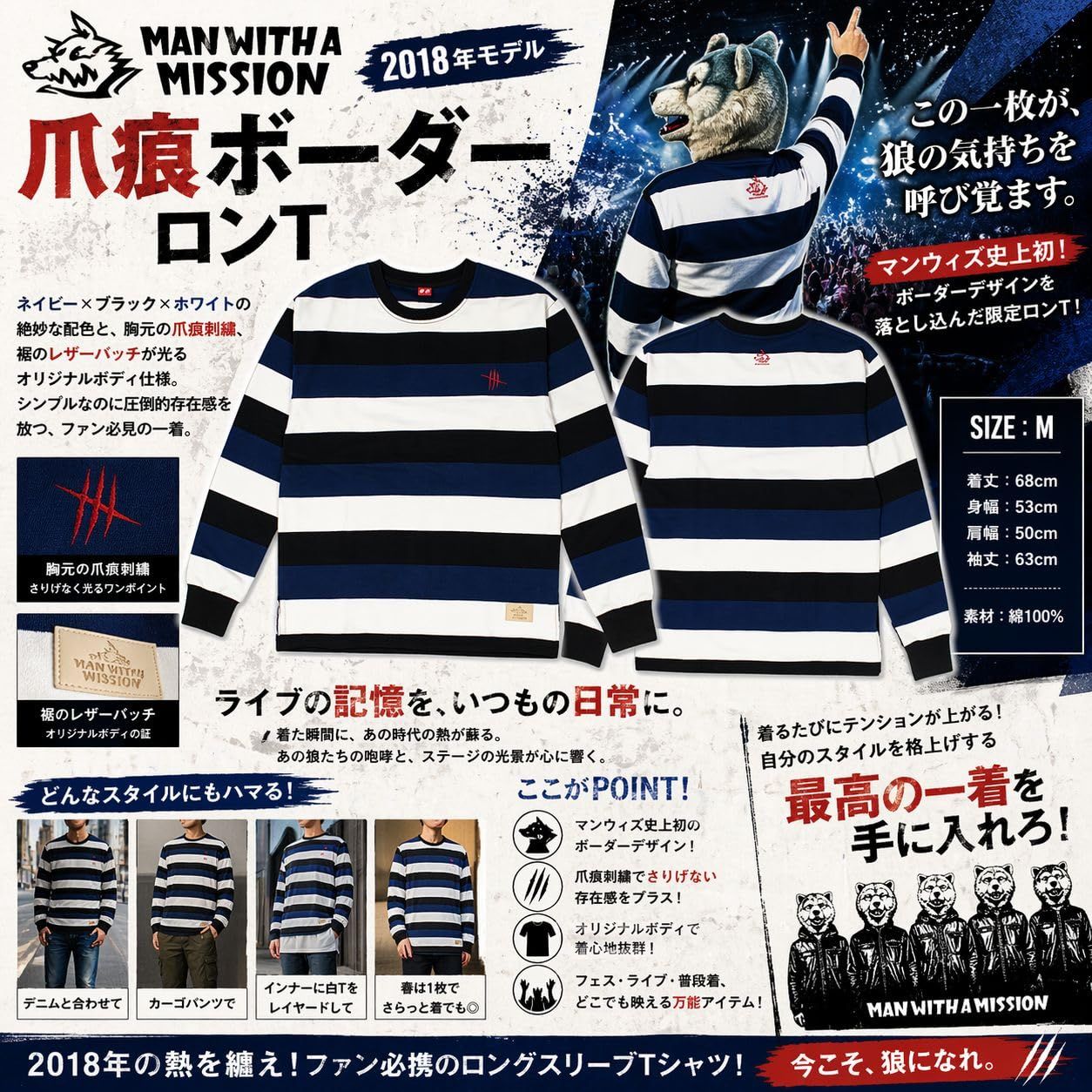 マンウィズ史上初となるボーダーデザインを落とし込んだ2018年モデルのロングスリーブTシャツは、ネイビー×ブラック×ホワイトの絶妙な配色と胸元の爪痕刺繍、裾のレザーパッチが光るオリジナルボディ仕様で、シンプルなのに圧倒的存在感を放つ一着。サイズはM(着丈68cm/身幅53cm/肩幅50cm/袖丈63cm)、WHITE