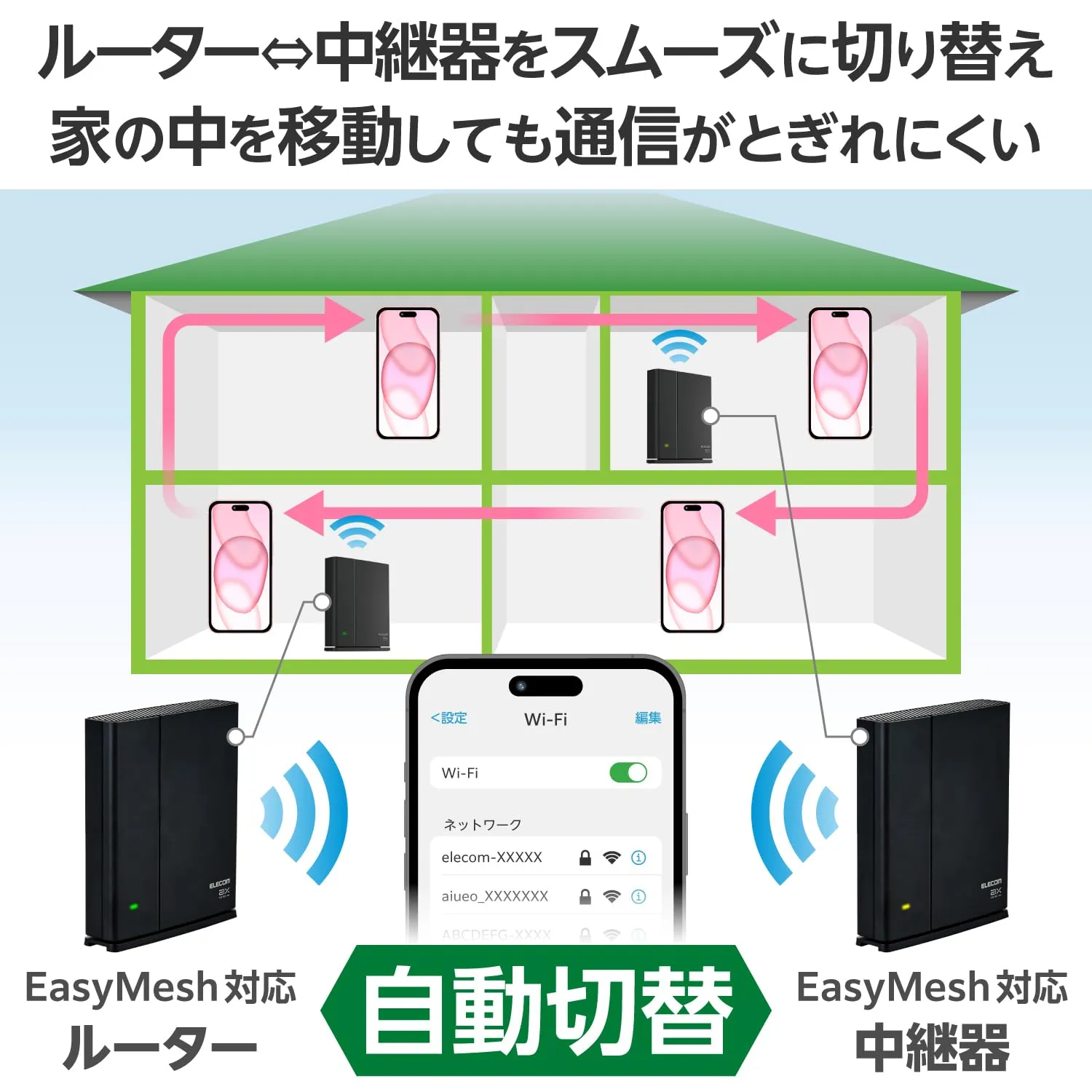 メッシュネットワークを構築することで、家中どこでも快適にインターネットを利用できるEasyMeshスターターキット(EasyMesh対応ルーター・EasyMesh対応中継器、各1台)です。追加で別売りのEasyMesh対応中継器単品モデルを増設することで、より広範にメッシュネットワークを構築できます。※1台のEasyMesh対応ルーターに2台のEasyMesh対応中継器の接続を推奨します。3台以上接続の場合、ご使用の環境により通信が不安定となる場合がございます。EasyMesh対応ルーターとEasyMesh対応中継器は、出荷時にWi-Fiペアリング済みですので、電源を入れるだけでメッシュネットワークを構築することが可能です。Wi-Fi