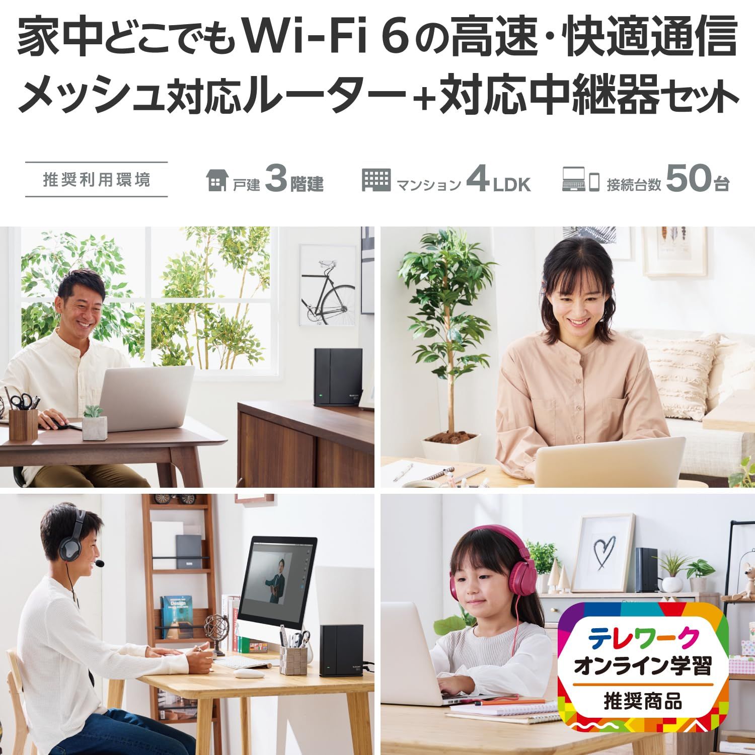 6対応でより安定した高速通信を実現しました。複数台同時接続に強いので、テレワークやオンライン学習にも最適です。複数台接続に強いOFDMA、送信情報量をアップする1024QAM、複数台同時接続が可能なMU-MIMO、スマホのバッテリーが長持ちするTWTなど、家族みんながWi-Fiに接続してもストレスなくスムーズな通信を実現します。戸建
