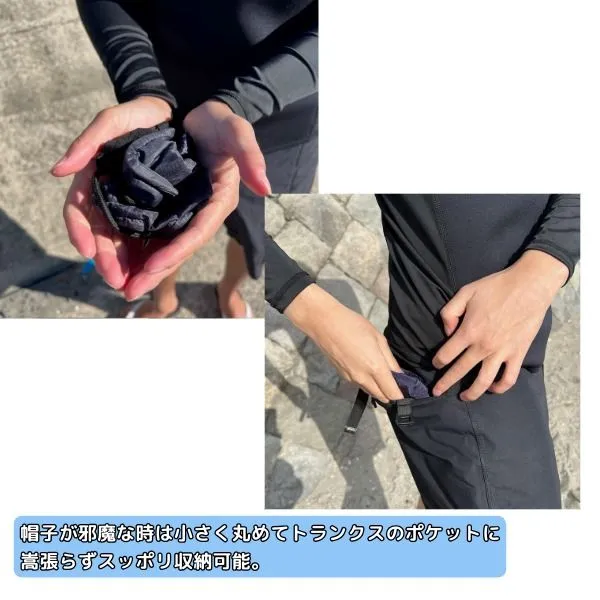 帽子が邪魔な時は小さく丸めてトランクスのポケットに嵩張らずスッポリ収納可能。