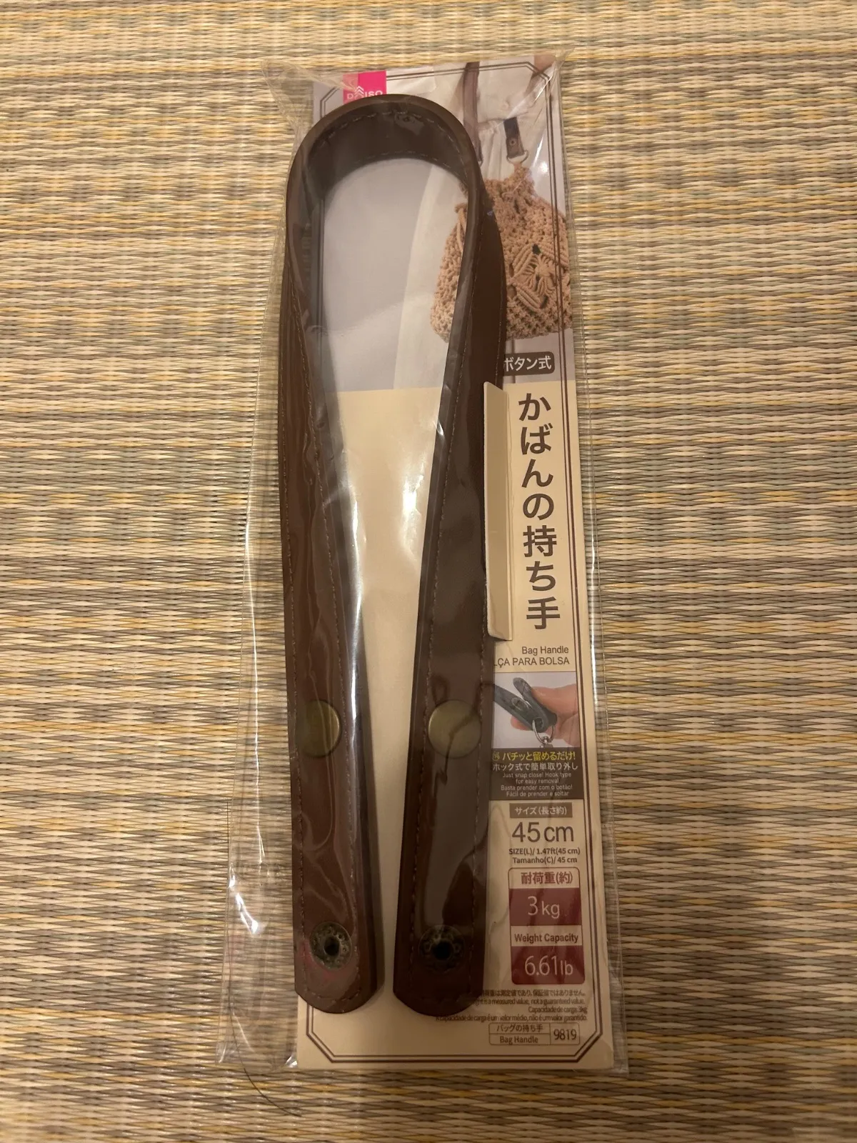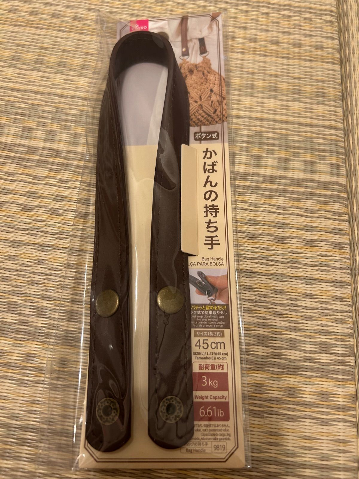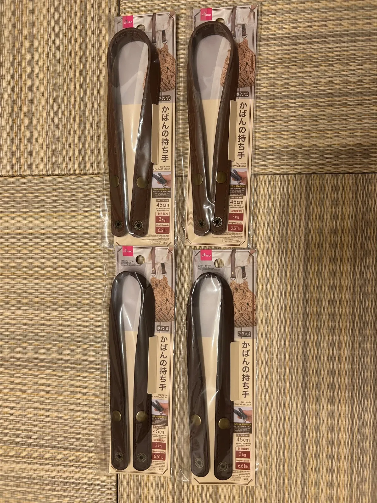 ダイソーかばんの持ち手 ボタン式になります。 長 さ / 約45cm 耐荷量 / 約3kg ブラウン×2 ライトブラウン×2 計4点 ★自宅保管につきご理解いただいた上での購入をお願いします。 ★メルカリ便にて匿名配送致します。 ハンドル トートバック レザー調 ハンドメイド 手作り 底板 クラフトパーツ