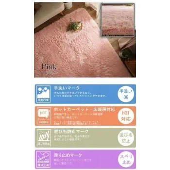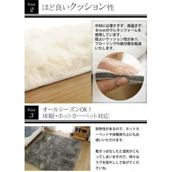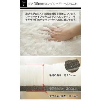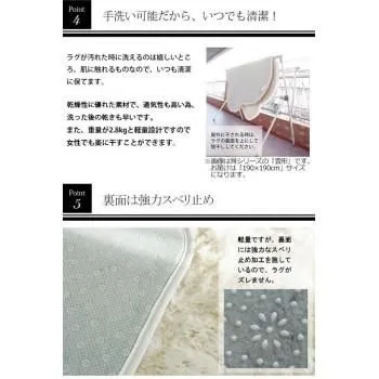 年中使用できて手洗い可能なマイクロファイバーロングシャギーラグです。滑り止め付きでラグがずれにくく、遊び毛の出にくい超極細繊維を使用しているため、さらさらの肌触り!!さらに耐熱加工を施しているので、ホットカーペット・床暖房にも対応しています。