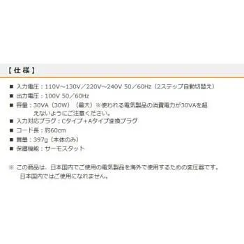 110V~130Vまたは220V~240Vの電圧を100Vに変圧する、海外旅行用変圧器です。入力プラグ形状はCタイプで、Aタイプ変換プラグが付属しています。